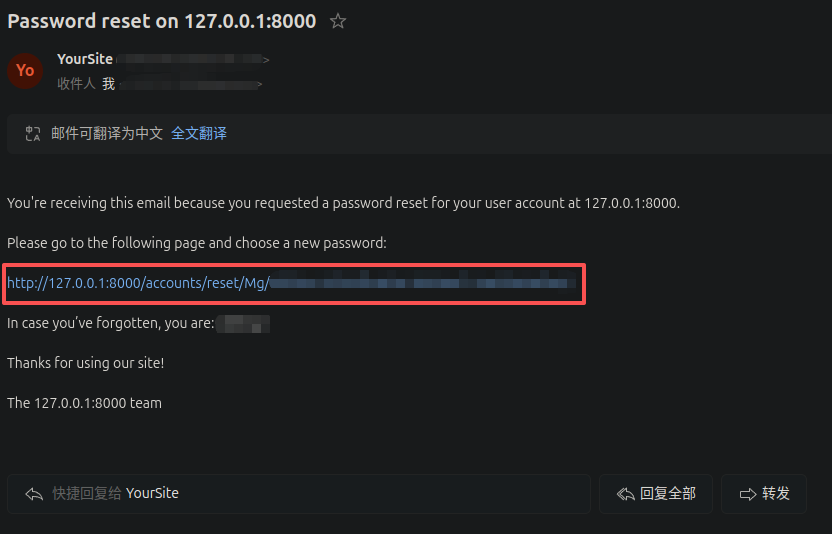 本地启动服务,并测试重置密码功能。可以看到 我的 gmail 向我的 qq 邮箱发送了如下信息: