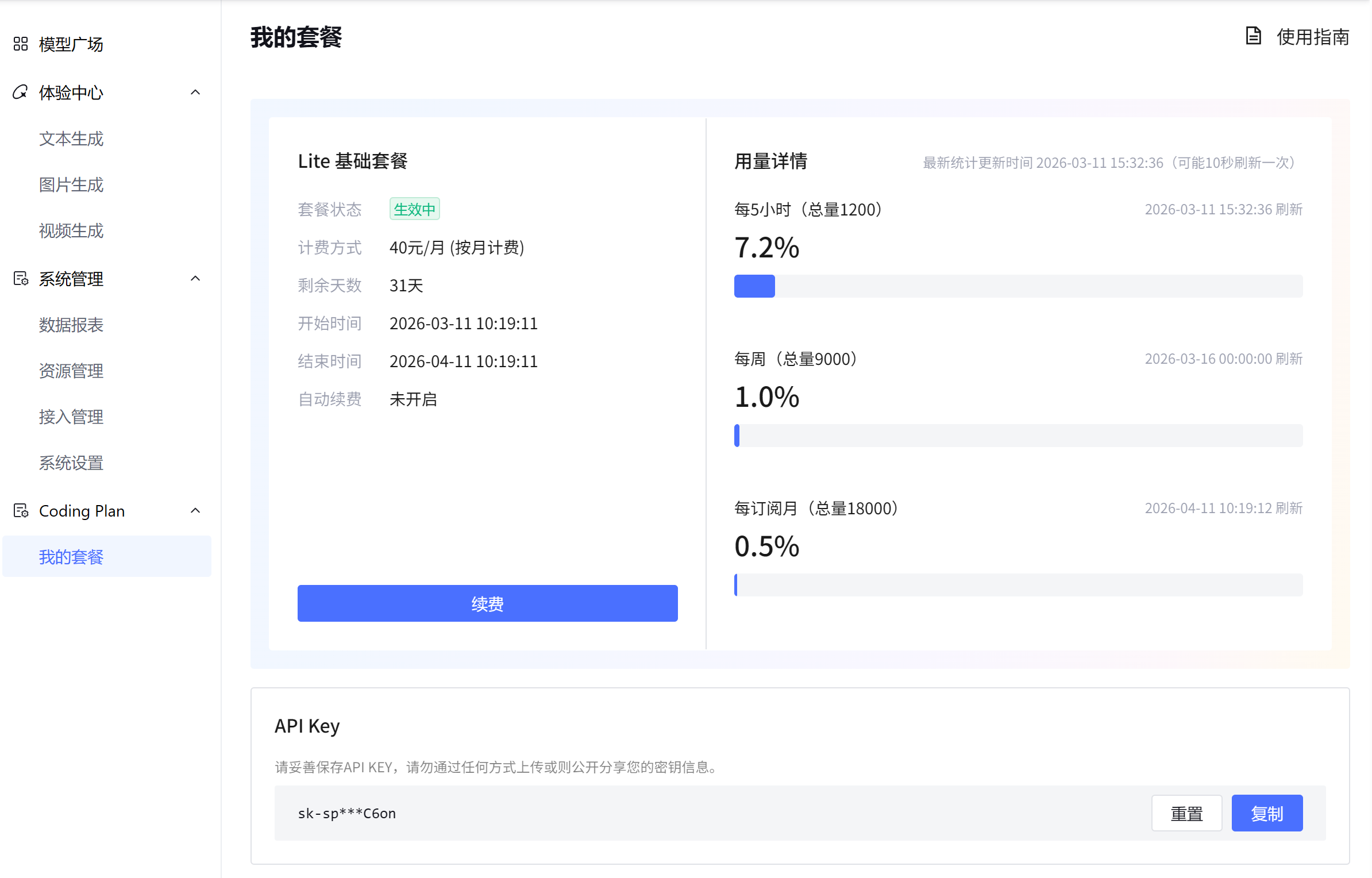 在这里可以获取 API Key,以及查看编码计划,和接入编程工具的文档入口。