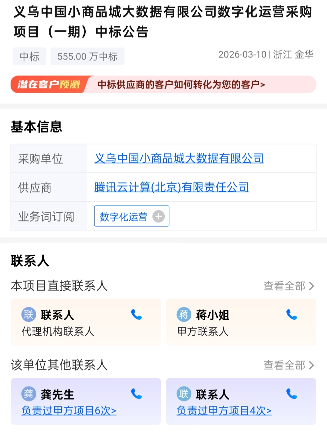 2026年3月10日,浙江金华发布义乌中国小商品城大数据有限公司数字化运营采购项目(一期)中标公告。该项目中标金额为555.00万元,由腾讯云计算(北京)有限责任公司中标,采购单位为义乌中国小商品城大数据有限公司。