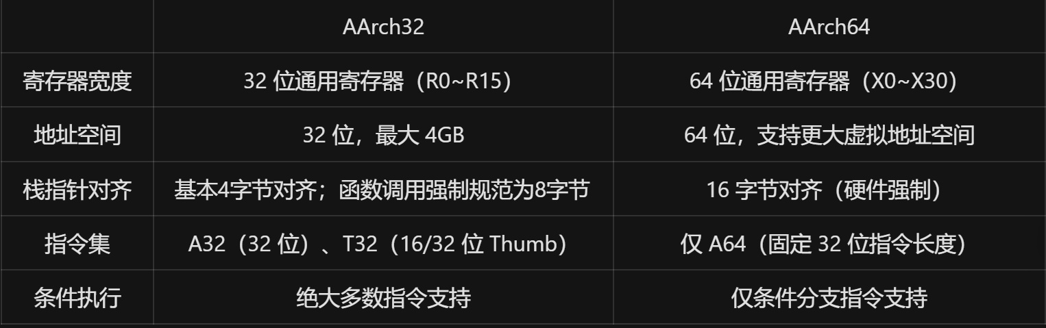 | 批量操作 | 支持 LDM/STM、PUSH/POP 等批量指令 | 移除批量指令,使用 LDP/STP 成对加载 / 存储 |