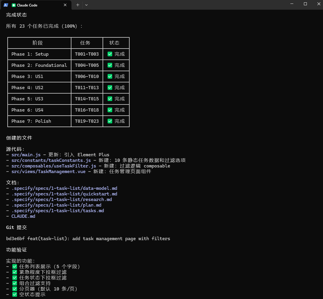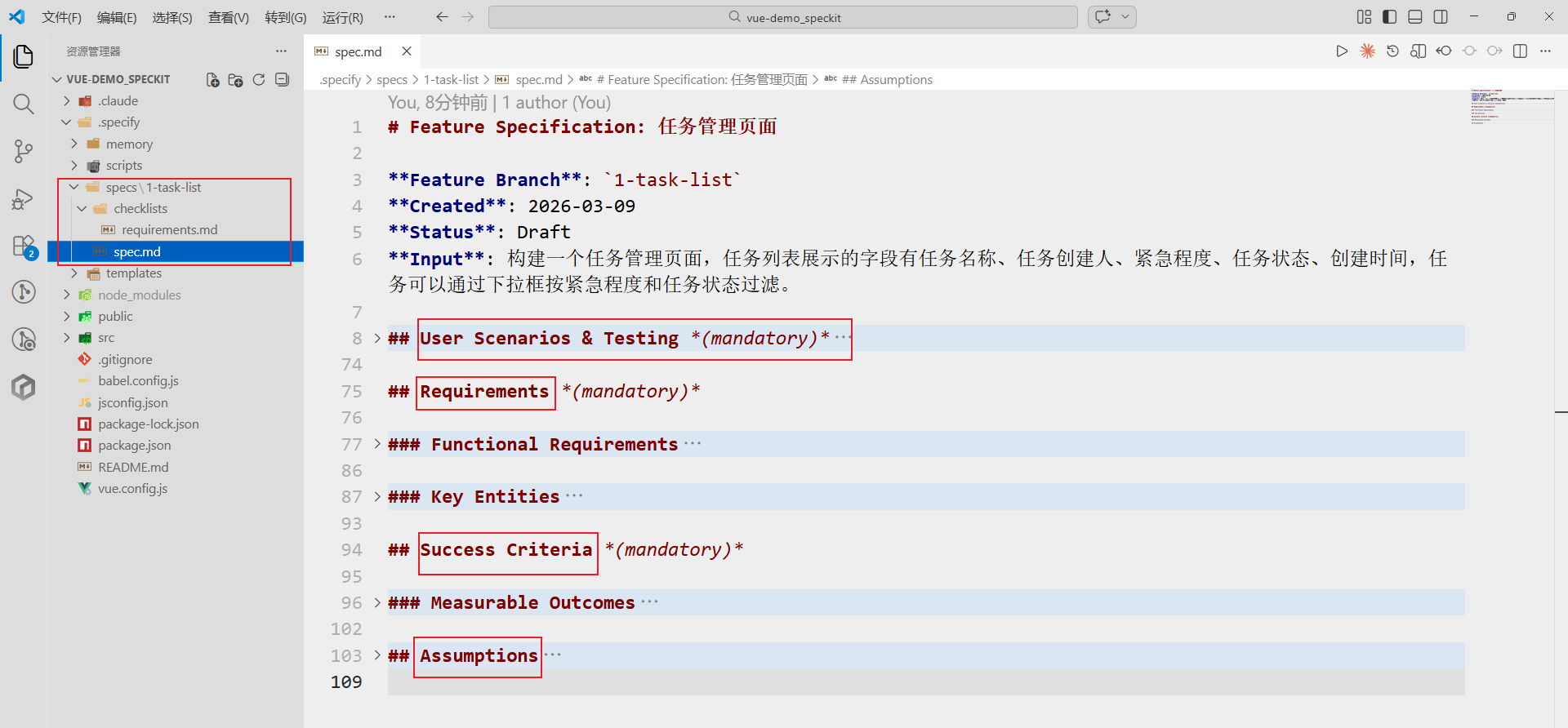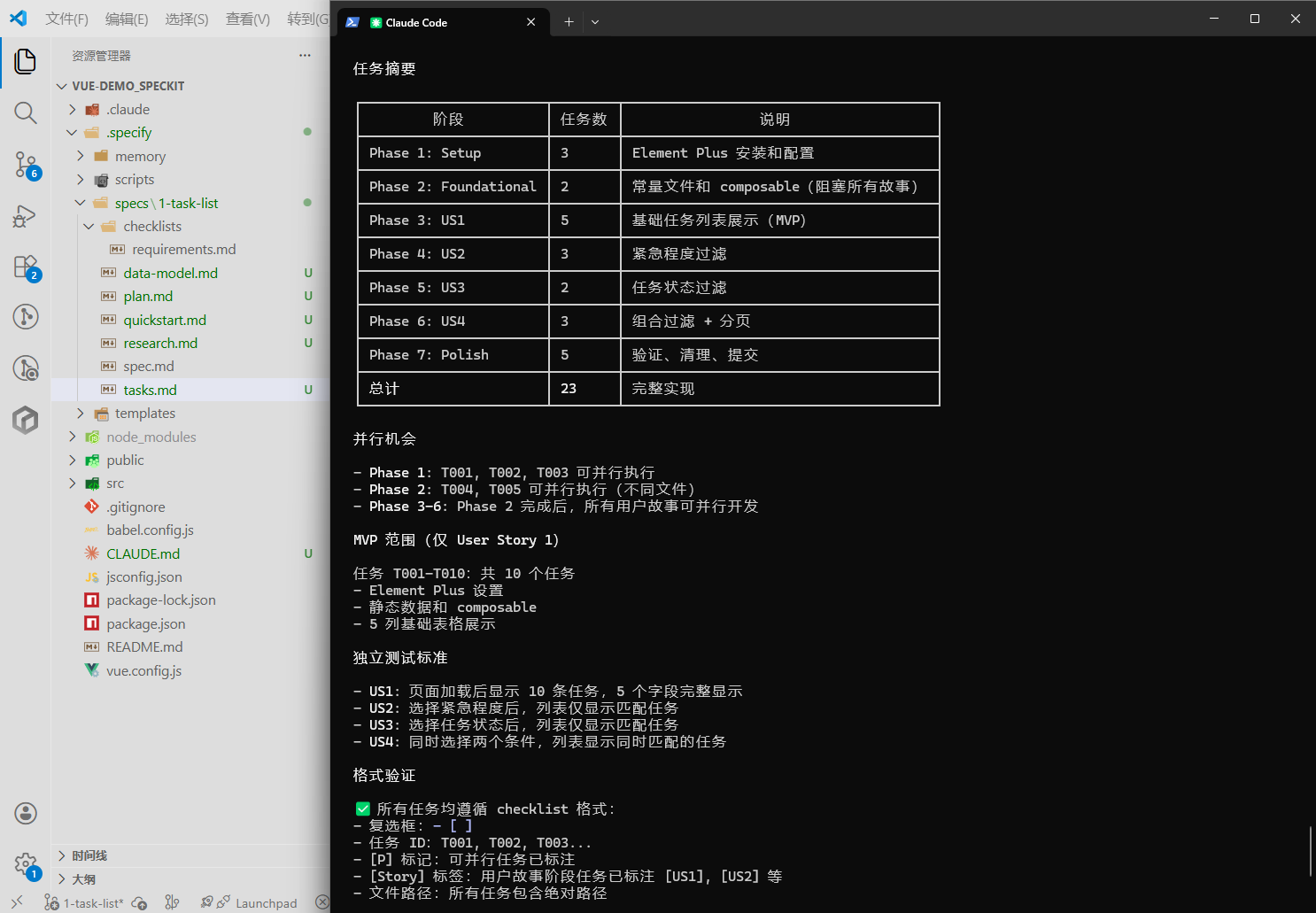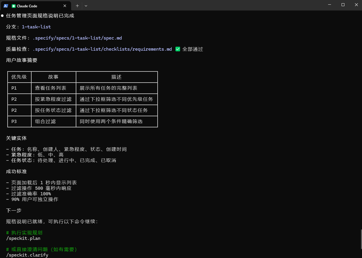 执行完成后,可以看到项目已经新建了 1-task-list 分支,并且已经有了 spec.md 和预生成的 checklist 文件夹。