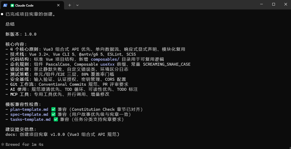 执行完成后自动创建中文的项目宪章,如果生成的内容中有不满意或者想修改的部分,可以指挥 AI 继续修改或者手动改一改。 PS:constitution.md 是spec 里最重要的内容之一,它是让后续迭代符合基本要求的保证。