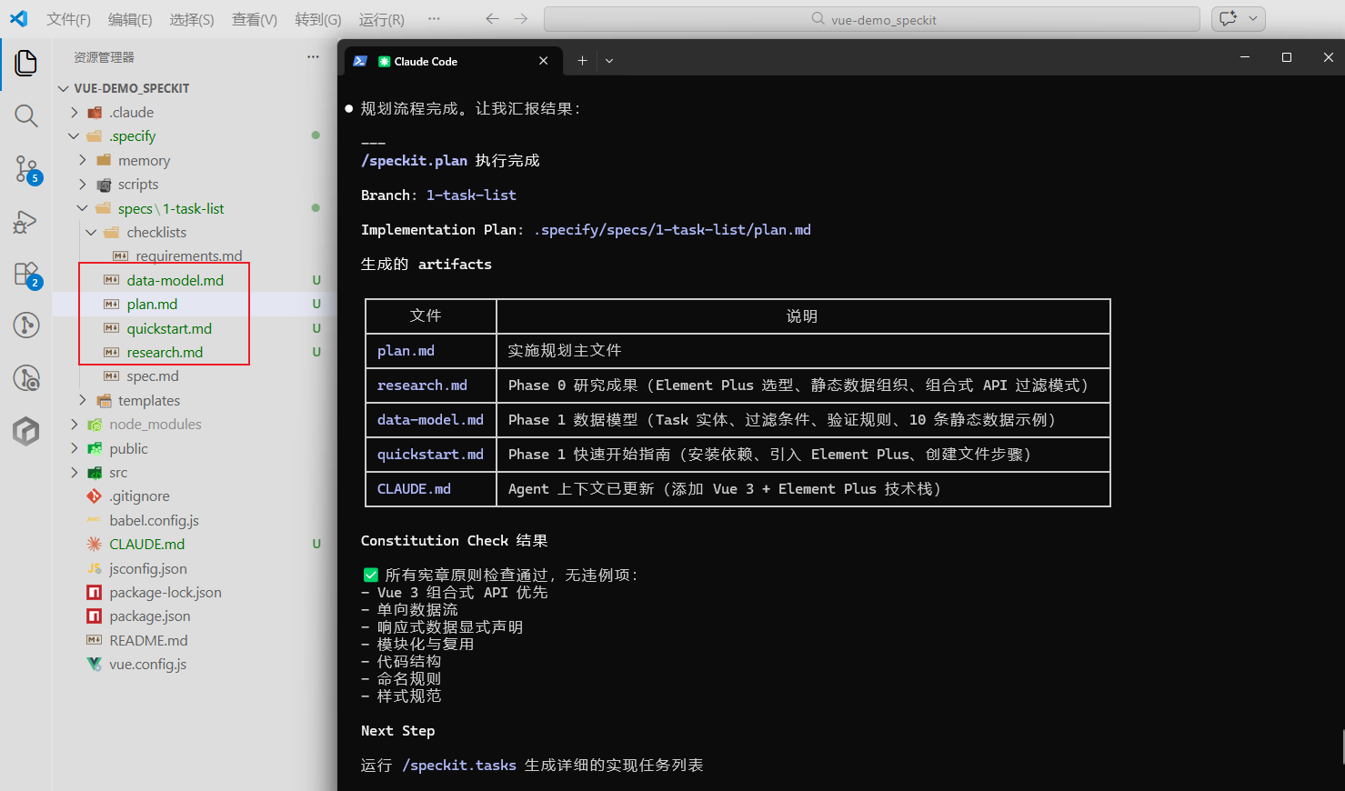 执行完成后多了以下一些产物,基于功能规范,AI 自动生成详细的技术实现计划,包括数据模型、接口契约、外部依赖、性能/安全要求