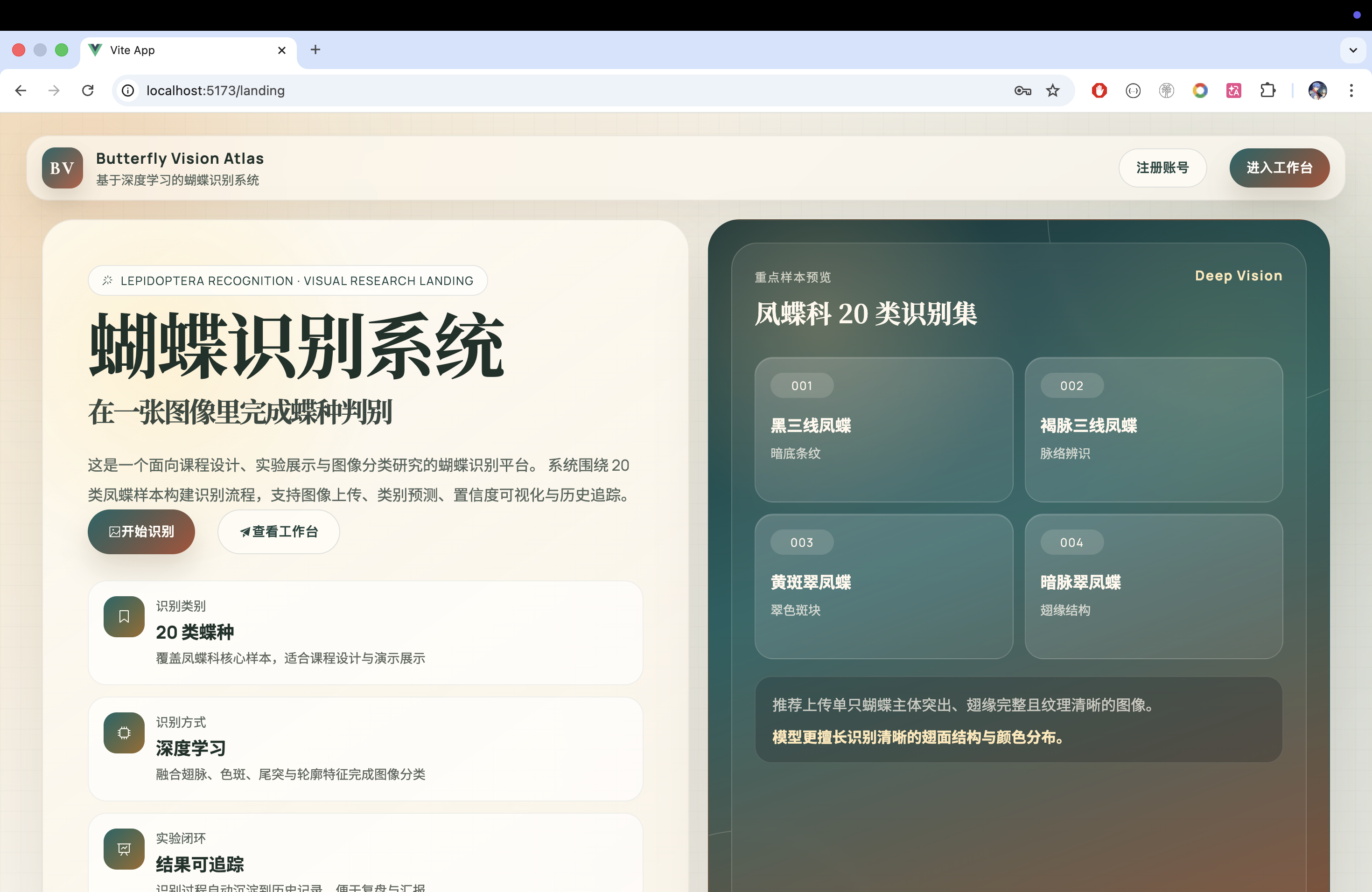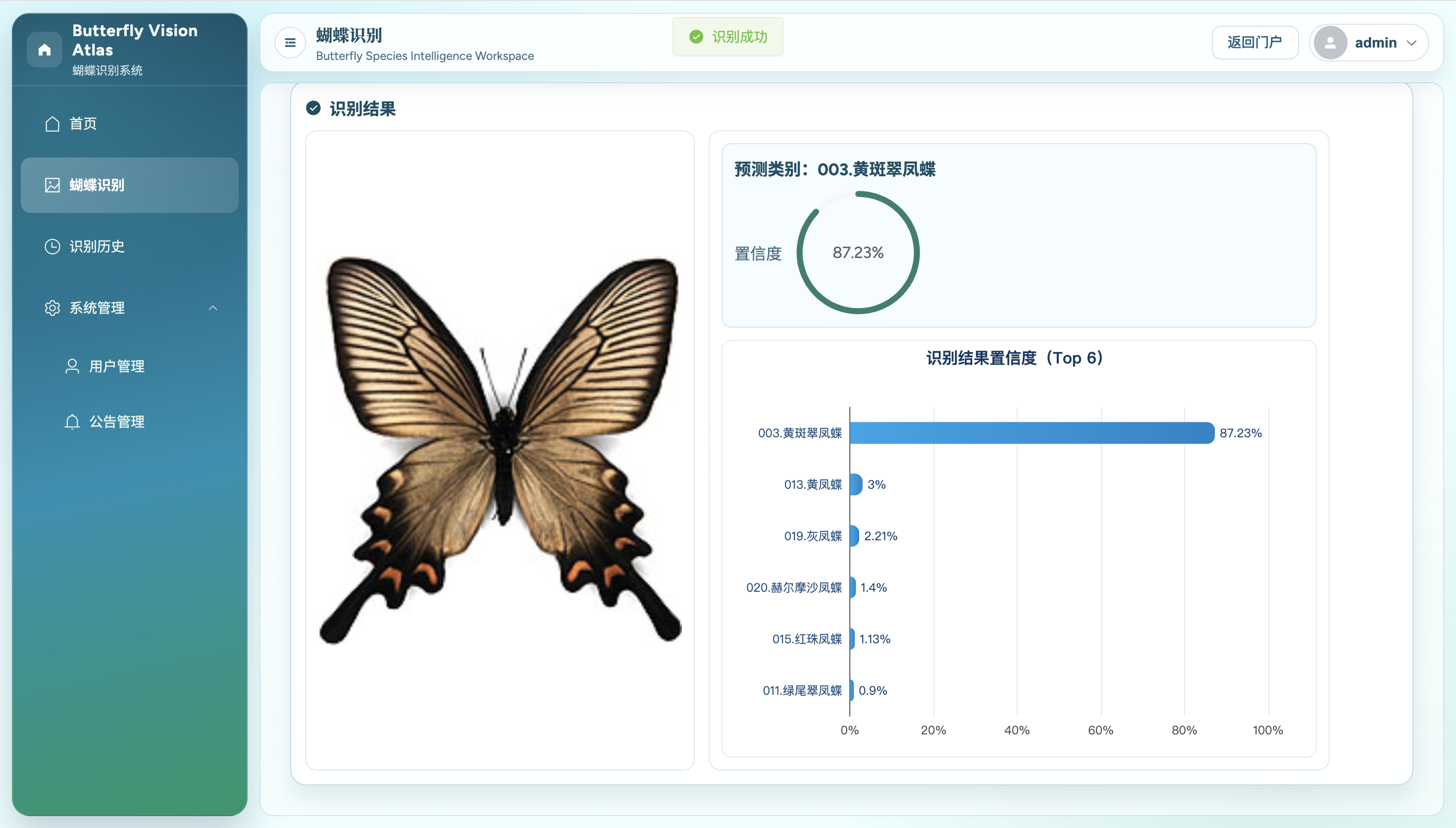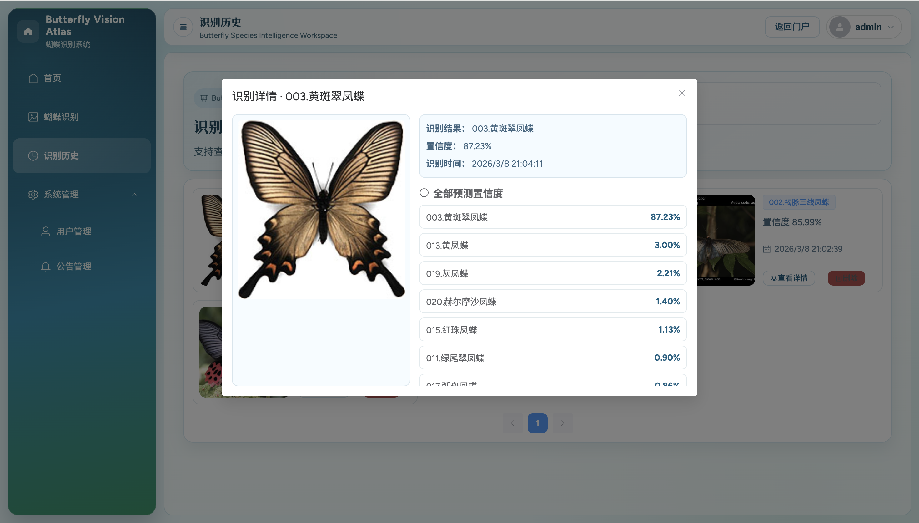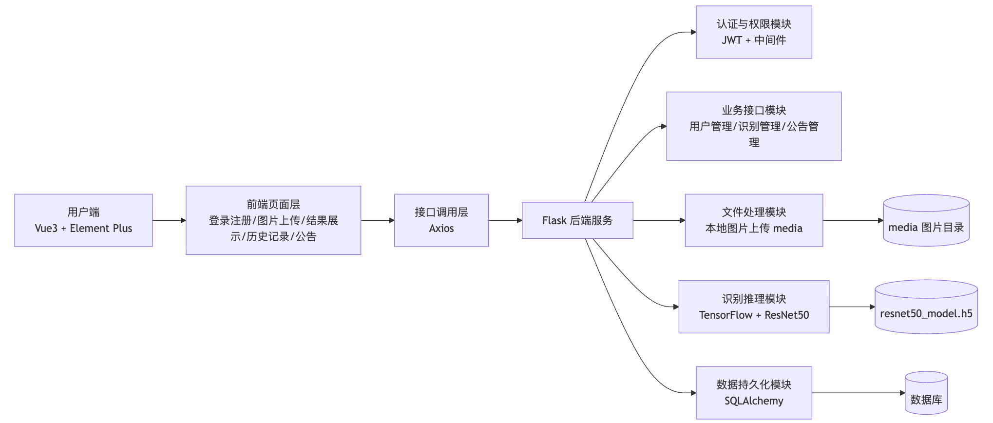 本项目为一个面向蝴蝶图像识别场景开发的智能识别系统,整体采用前后端分离架构实现。前端基于 Vue3 与 Element Plus 构建交互界面,负责完成用户登录注册、图片上传、识别结果展示、历史记录查询以及公告浏览等功能;后端采用 Flask 框架搭建 RESTful 接口,结合 JWT 实现用户身份认证与权限校验,并通过 SQLite 完成用户信息、识别历史和公告数据的持久化管理。在算法层面,系统使用 TensorFlow 深度学习框架加载训练好的 ResNet50 模型,对上传的蝴蝶图片进行特征提取与类别预测,当前可完成 20 种凤蝶类别的自动识别,并返回最高置信度结果及各类别预测概率。