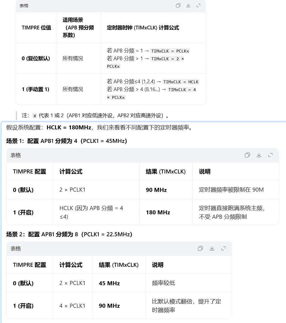 可以根据前面所讲进行配置寄存器(RCC_DCKCFGR)的TIMPRE位来设置定时器的时钟频率,一般设置该位为0,即TIMx_CLK = 总线时钟 * 2,最大定时器时钟为84Mhz。