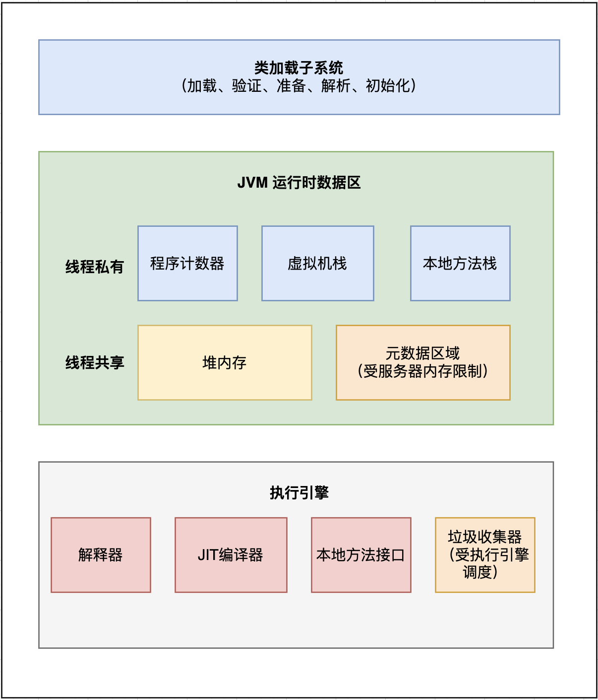 JVM是一个完整的执行体系,整体分为三大核心模块,执行流程自上而下,缺一不可: