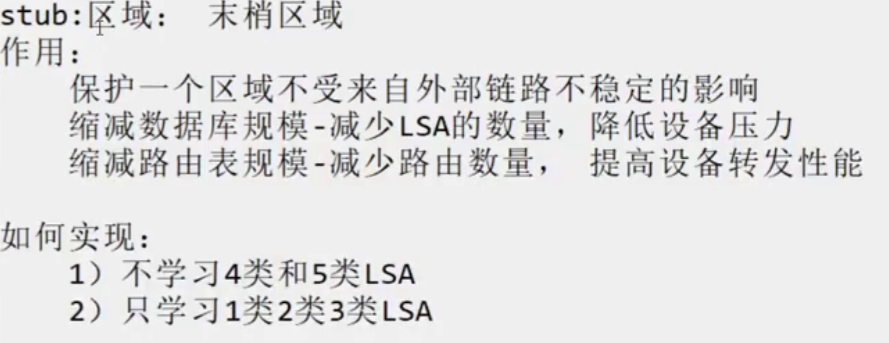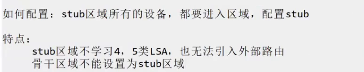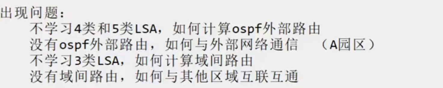 缺点 :区域内不能有任何ASBR,即不能引入任何外部路由(静态、直连、其他协议的路由)。
