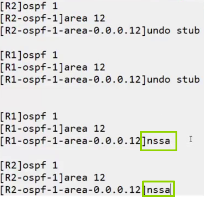 | 转换机制 | NSSA的ABR会将7类LSA转换成5类LSA,注入到骨干区域 |