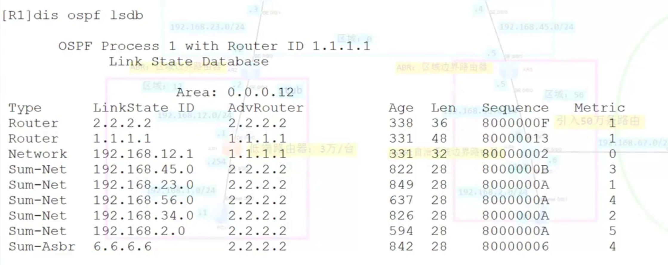 | 区域内路由 | 一类、二类LSA | 本区域的详细拓扑 |