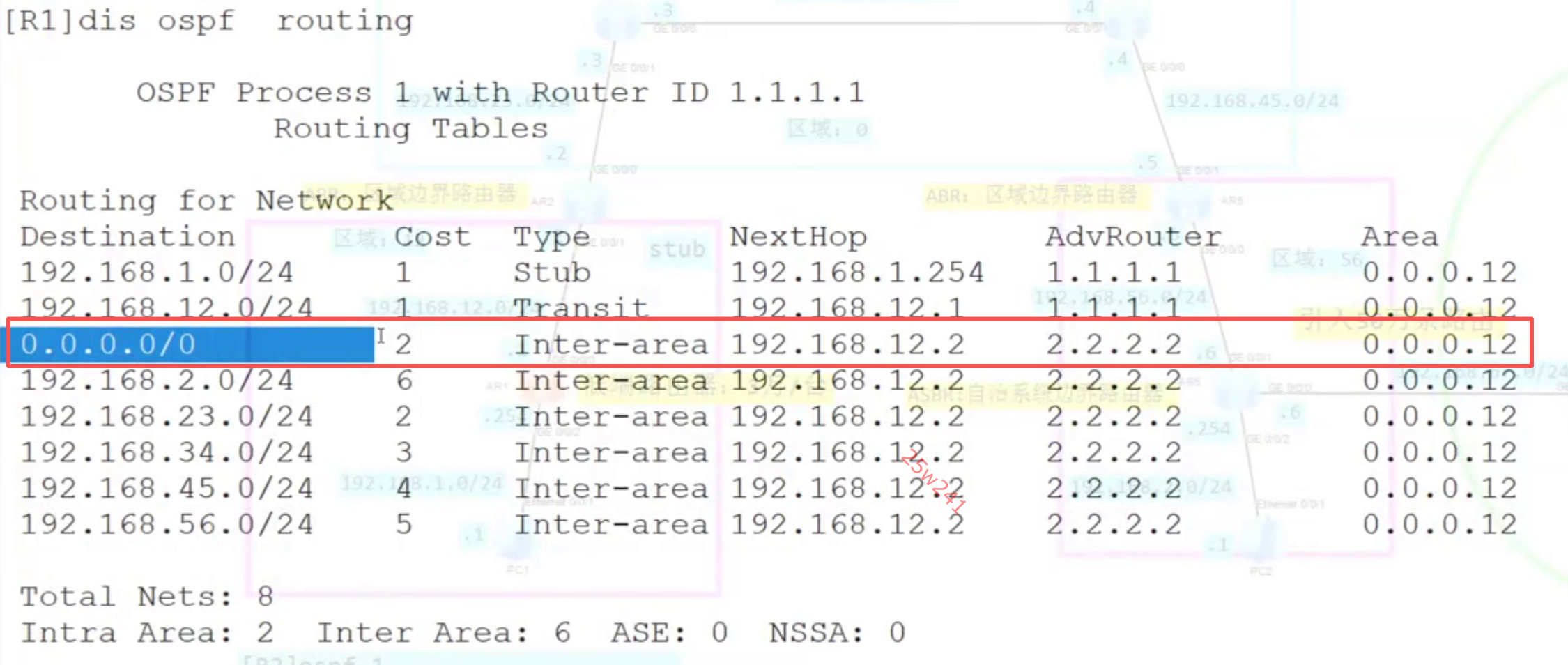 display ospf lsdb------确认没有4类和5类LSA,但有一条默认路由(0.0.0.0/0)的三类LSA。 -