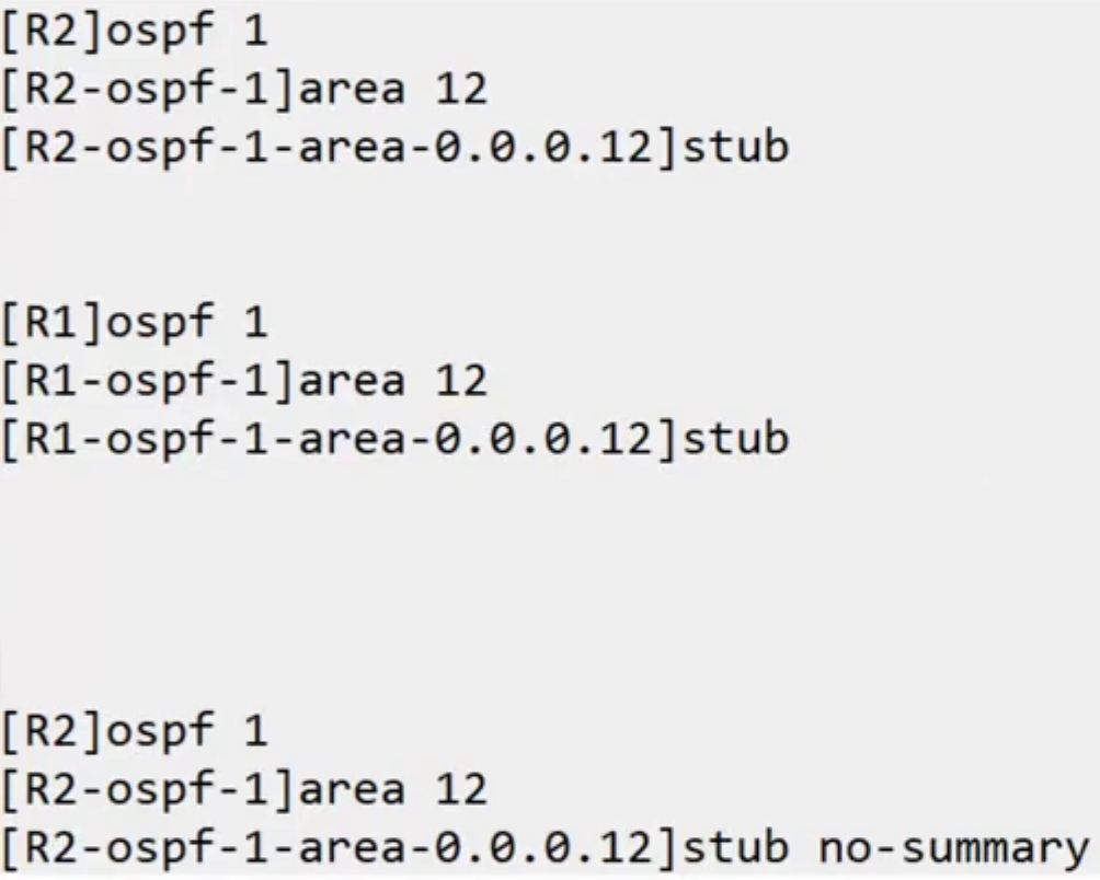 一致性 :Stub区域内的所有路由器(包括ABR)都必须配置为Stub区域,否则邻居关系无法建立(Hello报文中的Stub标志位不匹配)。