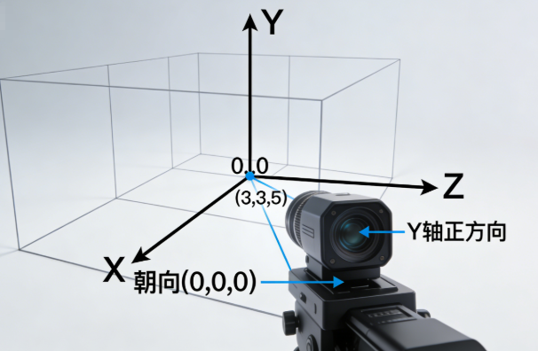 // 摄像机在(3,3,5),盯着原点看,Y轴向上(符合人眼习惯)
