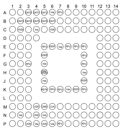 具体引脚分布需要看对应型号的数据手册(Datasheet)。不同品牌(三星、海力士、闪迪)的eMMC,引脚位置可能不一样,但功能定义是统一的。
