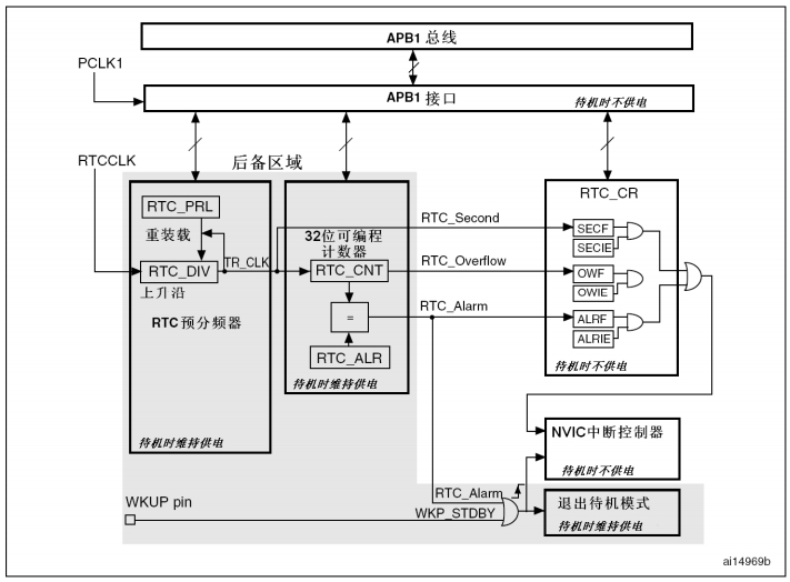 从图中可以看出, 浅灰色的部分都是属于备份域的, 在 VDD 掉电时可在VBAT 的驱动下继续运行。 这部分仅包括 RTC 的分频器, 计数器, 和闹钟控制器。若 VDD 电源有效, RTC 可以触发 RTC_Second(秒中断)、 RTC_Overflow(溢出事件)和 RTC_Alarm(闹钟中断)。 从上图可以分析到, 其中的定时器溢出事件无法被配置为中断。 若 STM32 原本处于待机状态, 可由闹钟事件或 WKUP 事件(外部唤醒事件, 属于 EXTI 模块, 不属于 RTC)使它退出待机模式。 闹钟事件是在计数器 RTC_CNT 的值等于闹钟寄存器 RTC_ALR 的值时触发的。