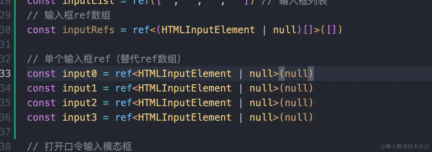 如果使用input写死4个的话,就不能用vue3的动态ref来自动获取四个输入框元素,而是要把四个ref元素都写出来: