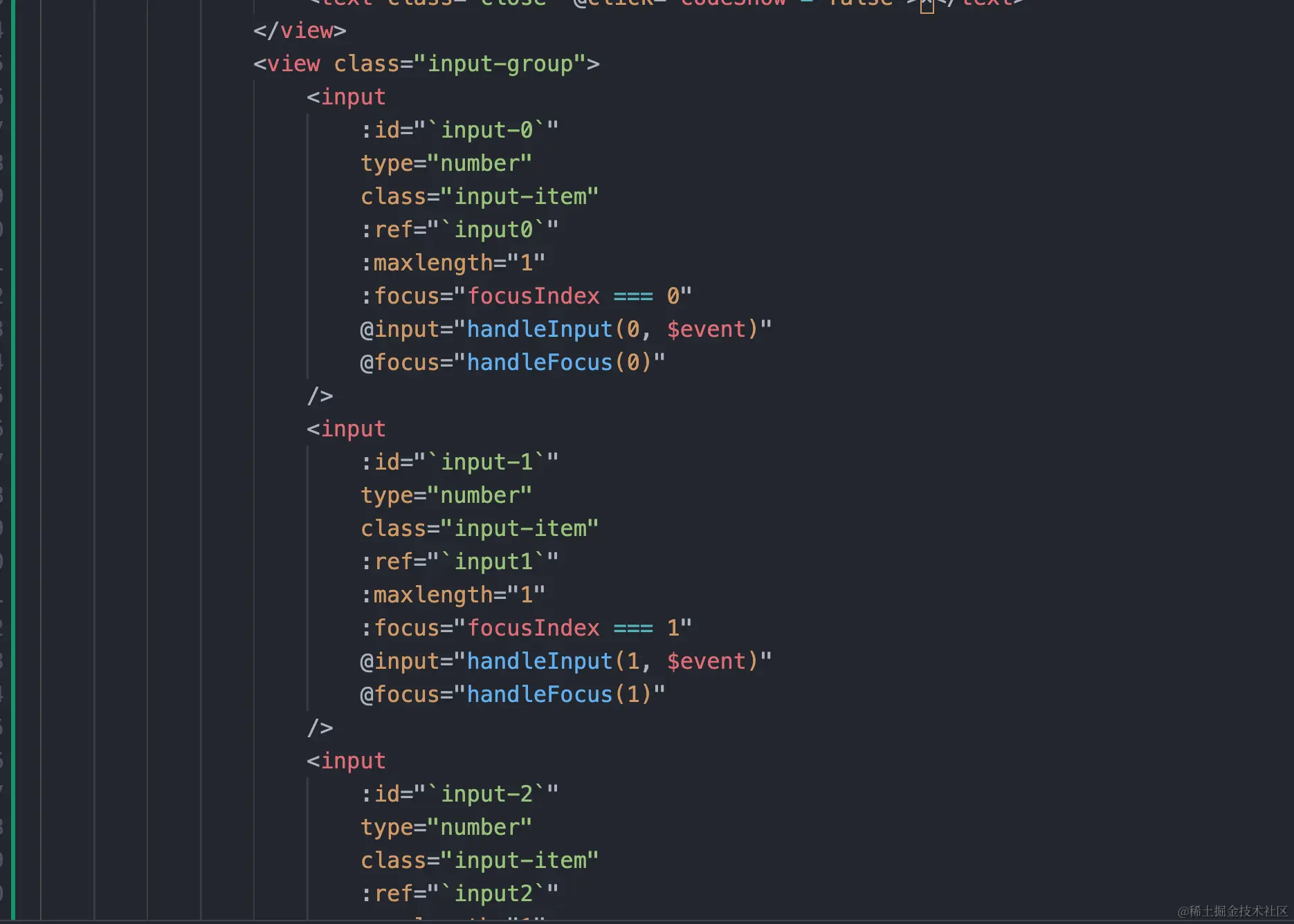 <!-- 手动声明4个输入框,统一绑定通用的handleInput,传入索引 -->