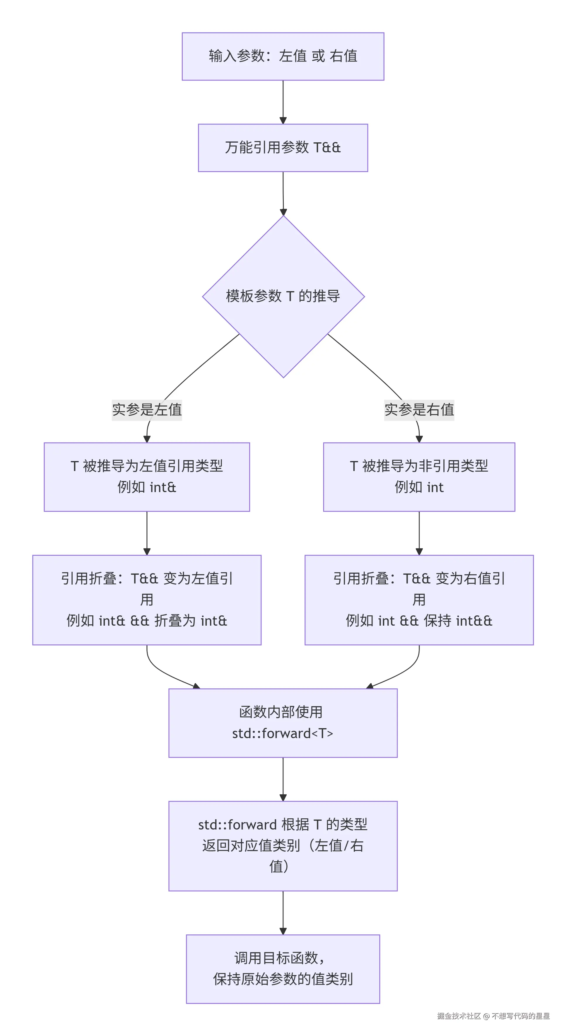 万能引用、引用折叠与完美转发流程的流程图