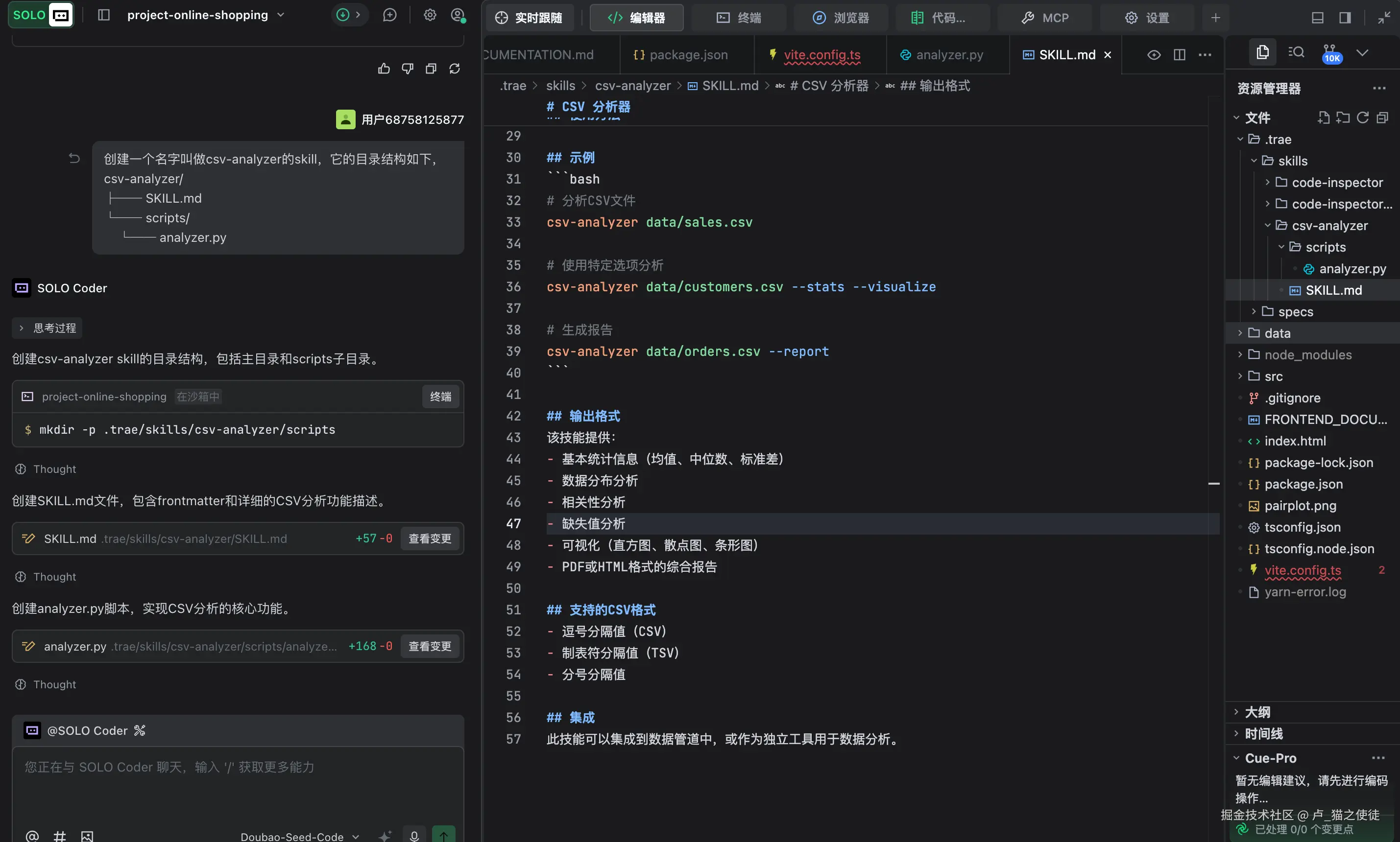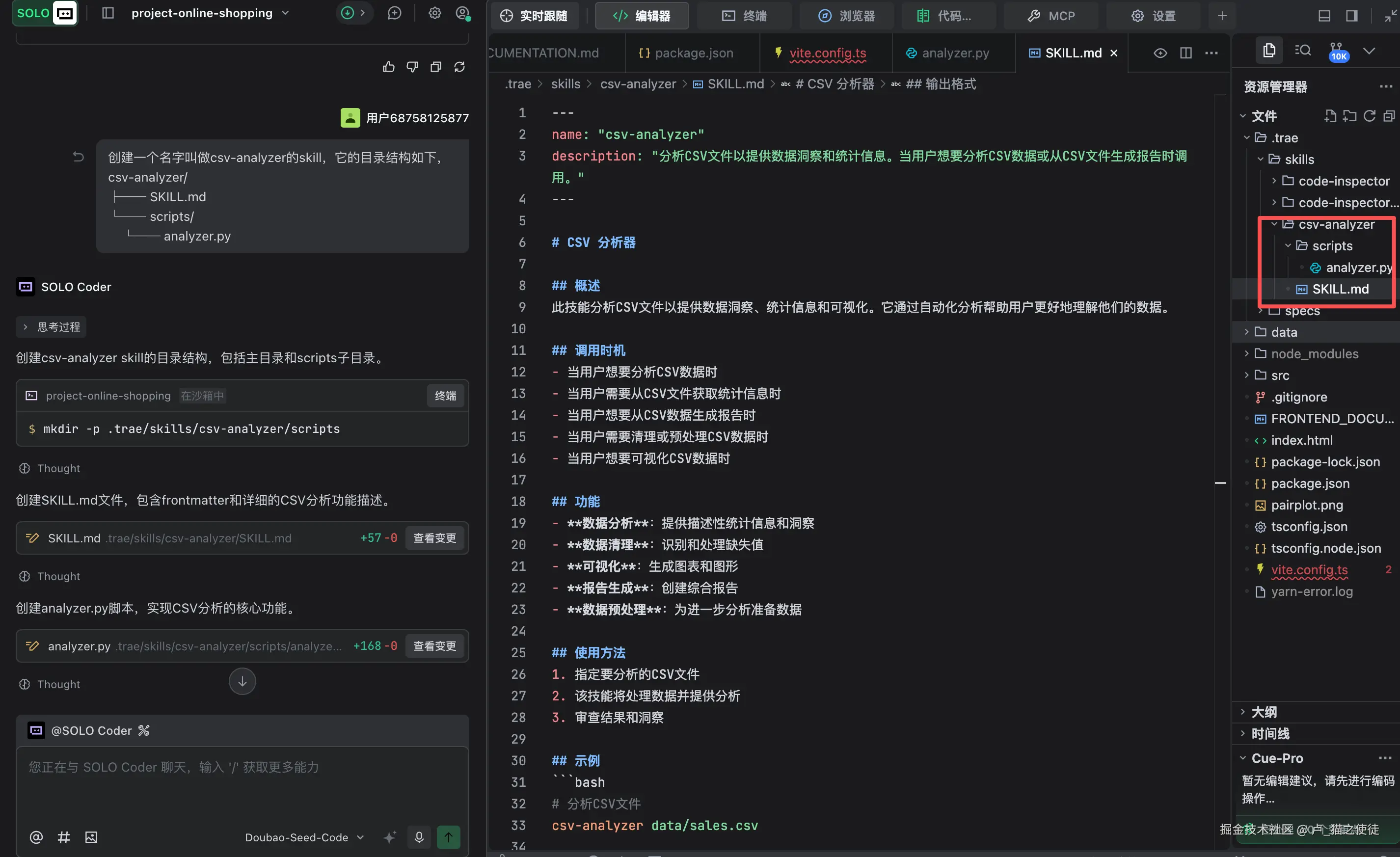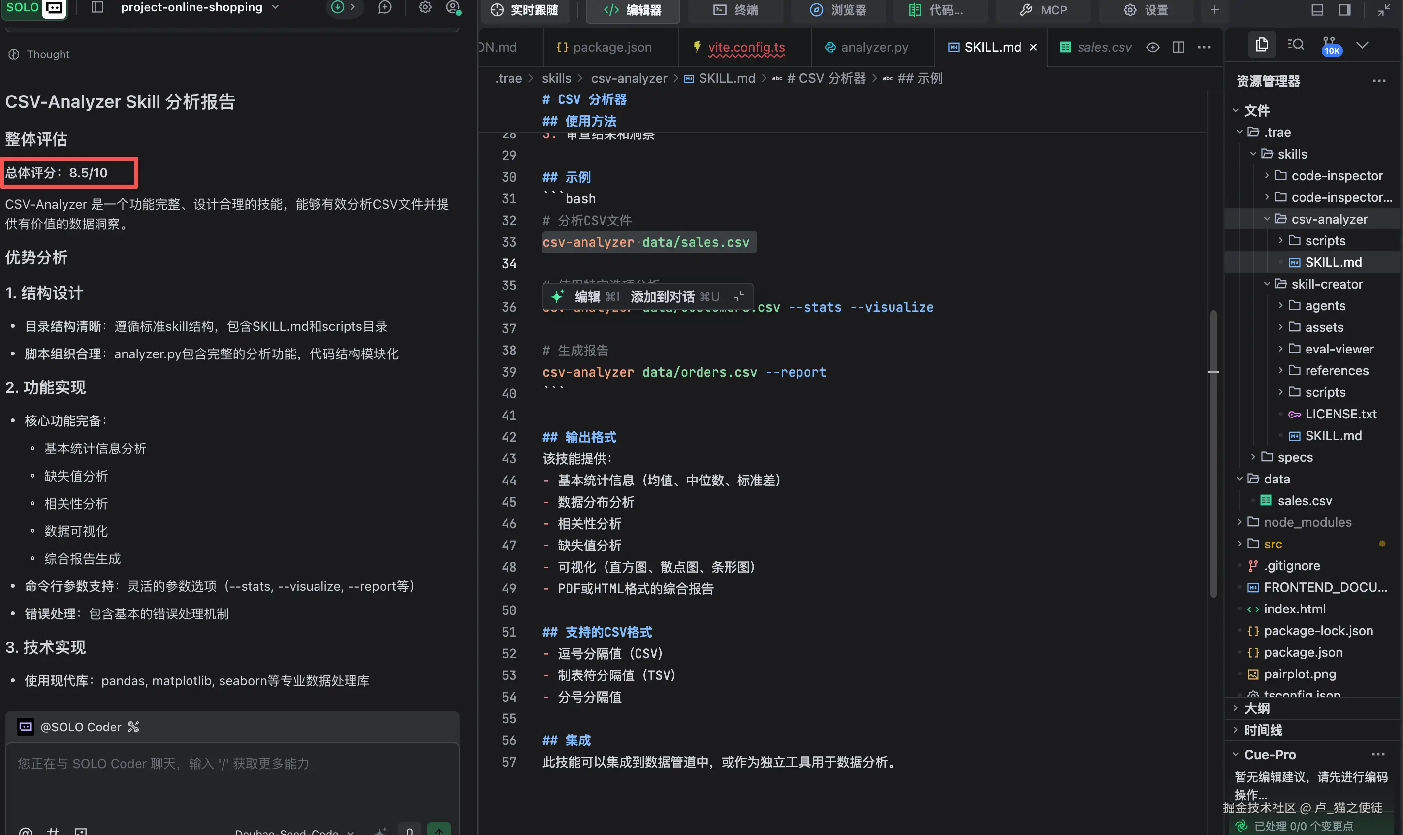 1.首先来看一个示例,我用trae自带的编辑功能帮我生成一个csv文件分析器的Skill