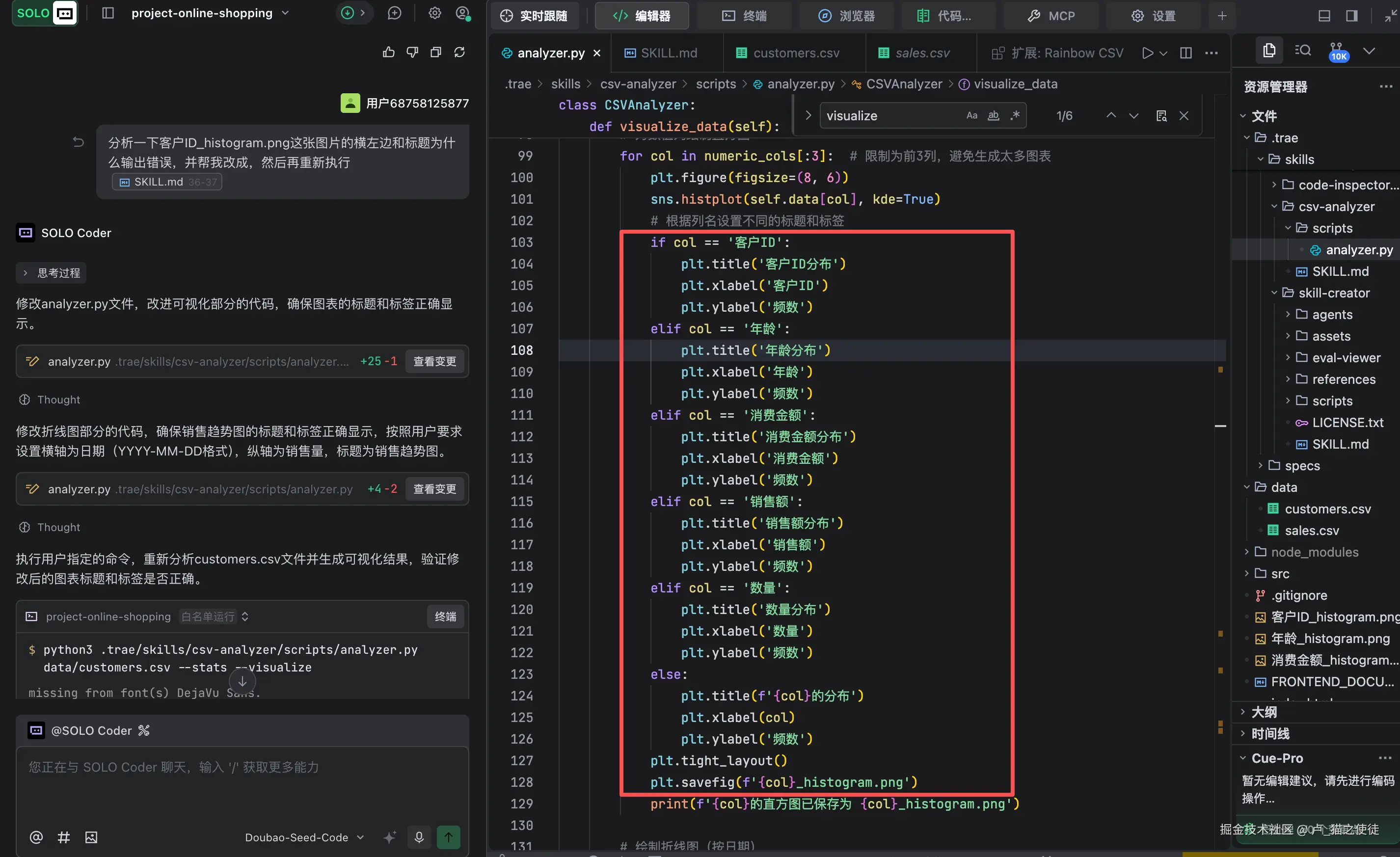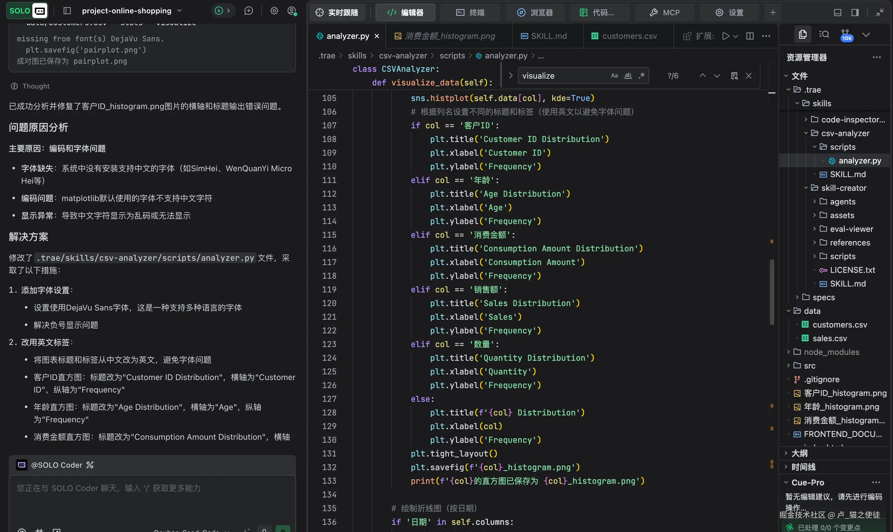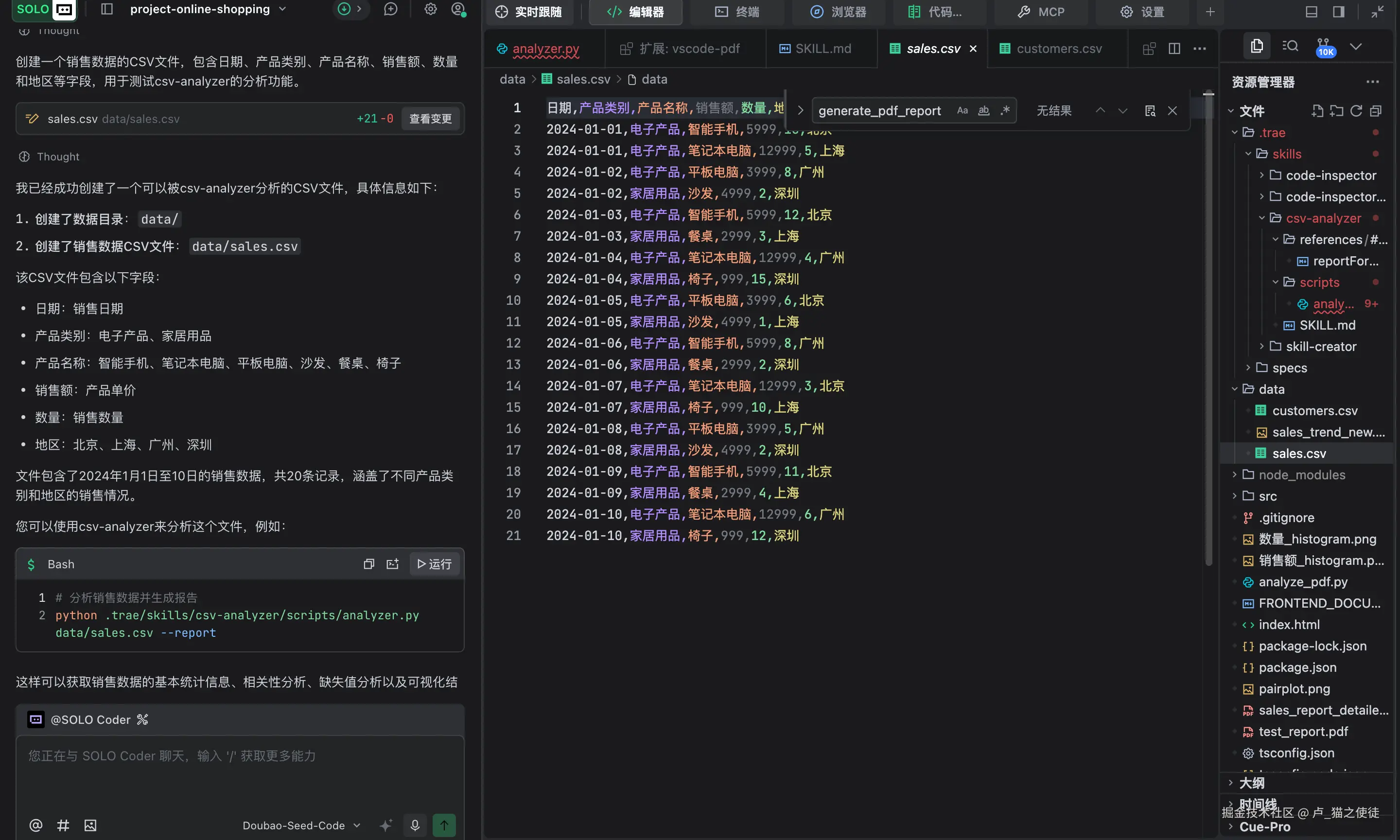 1.首先来看一个示例,我用trae自带的编辑功能帮我生成一个csv文件分析器的Skill
