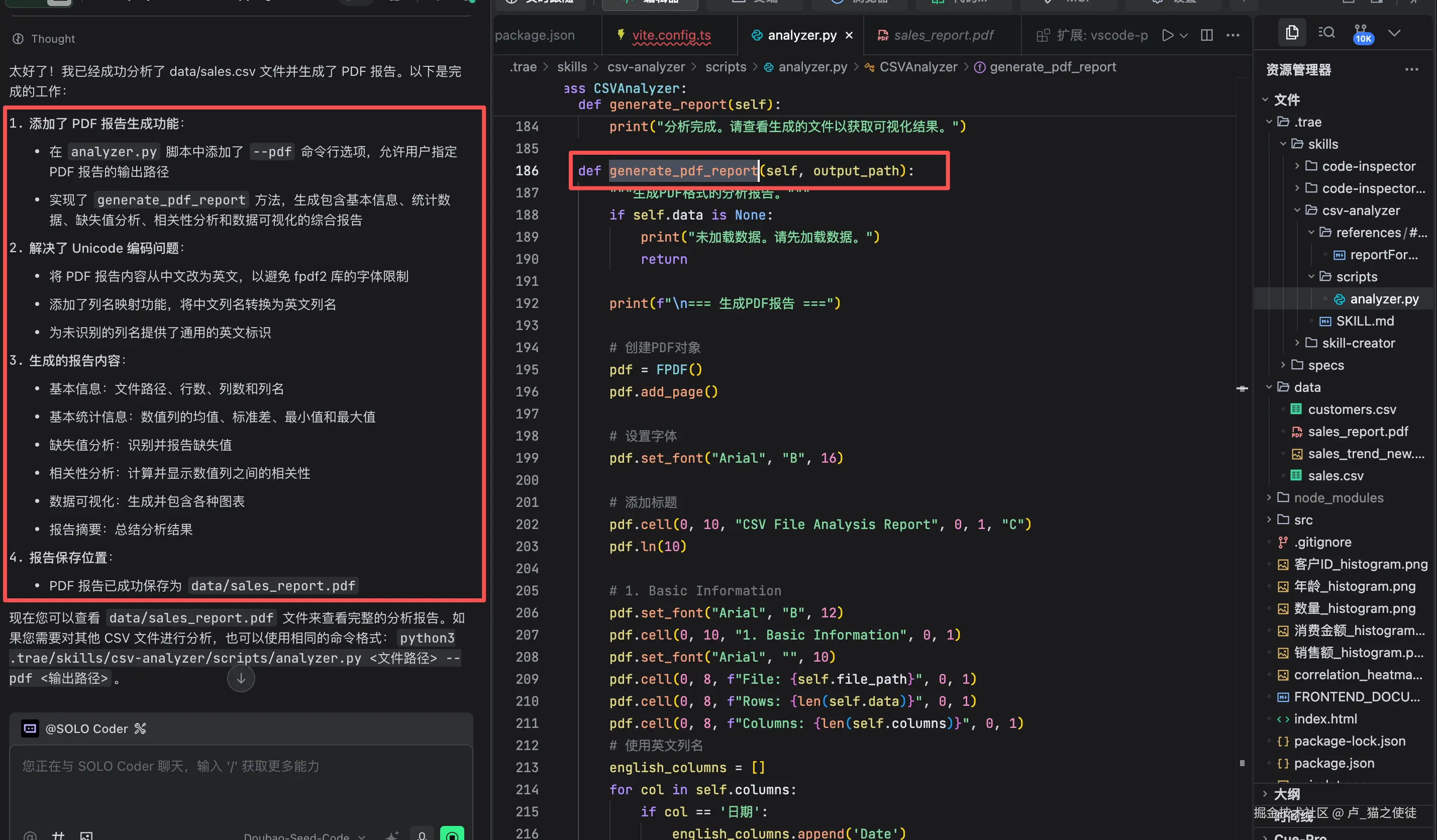 然后我输入:分析data/sales.csv文件并生成pdf报告,保存在data目录下