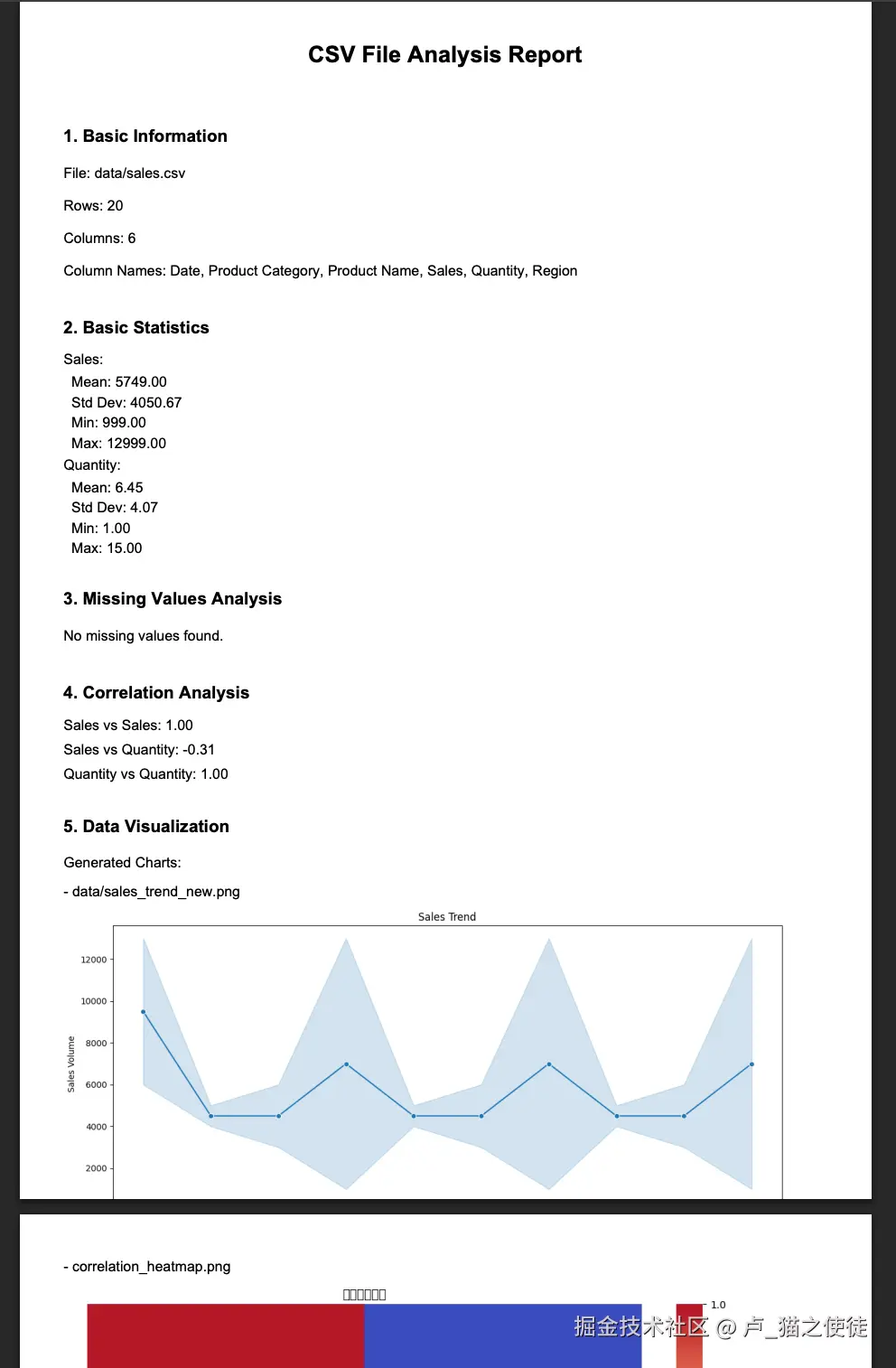 执行一下bash指令:csv-analyzer data/sales.csv,可以看到,它帮我生成了一份sales.csv数据并进行分析