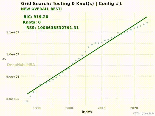 本文展示了如何将变化点检测转化为一个优化问题:通过网格搜索遍历候选节点配置,用惩罚似然准则(BIC)选出最优模型,配合分段回归完成趋势变化点的自动检测。