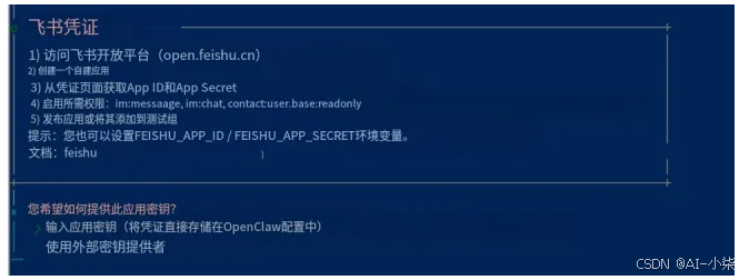 10.飞书凭证配置:下载完成后会提示输入飞书的密钥,按照提示,输入飞书开放平台自建应用的App ID与App Secret,输入完成后按回车,系统会自动完成连通性测试(这里Openclaw还细心的提供了飞书凭证获取和内部配置的流程)