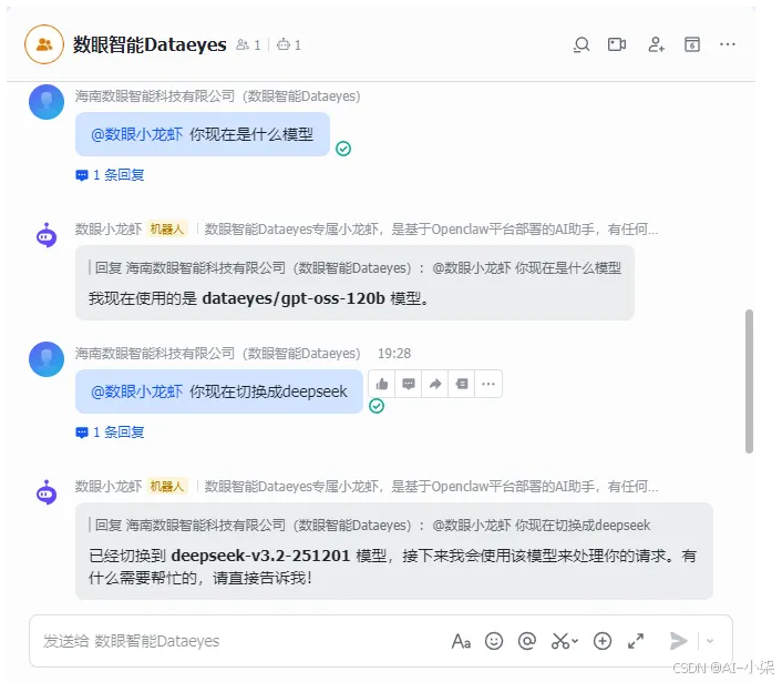 启动完成后,即可在之前配置的飞书等渠道,@机器人触发对话,实测效果如下: