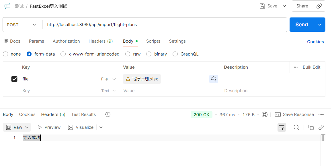Body标签中选择form-data,添加 key 为file,类型为File,选择本地 Excel 文件 - 发送请求,返回