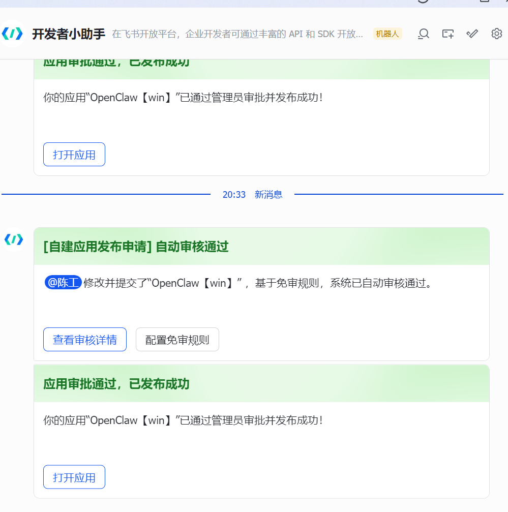 - 创建版本,提交审核(企业自建应用通常自动通过)
