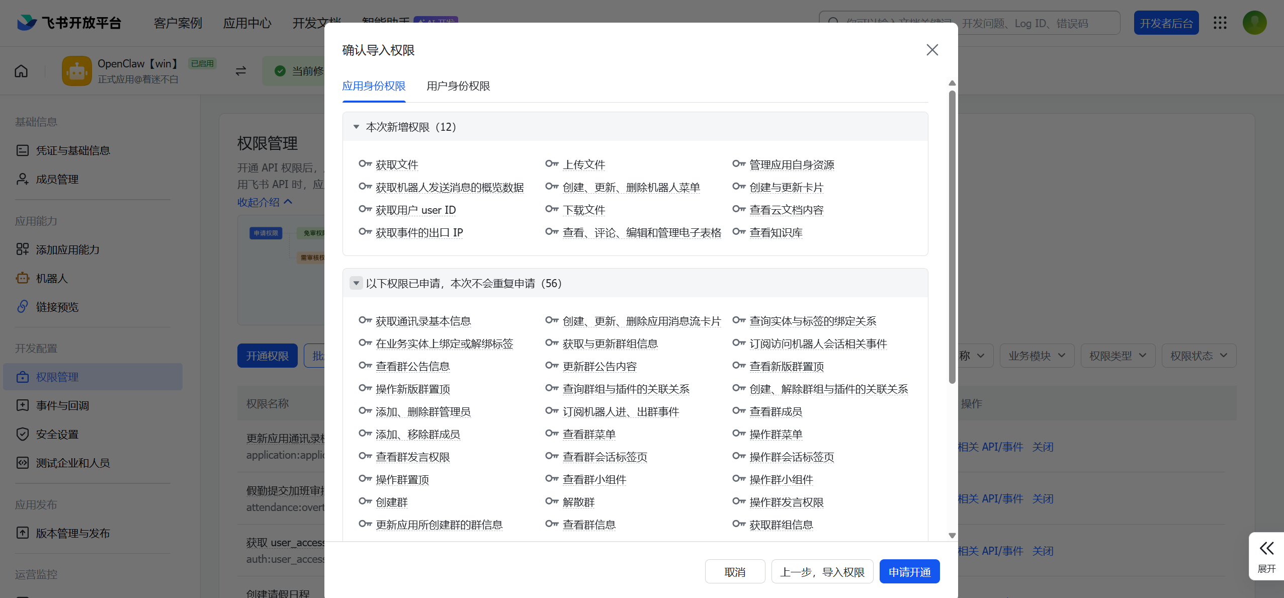 - 点击「导入权限」,粘贴以下 JSON 权限配置(可按需精简):