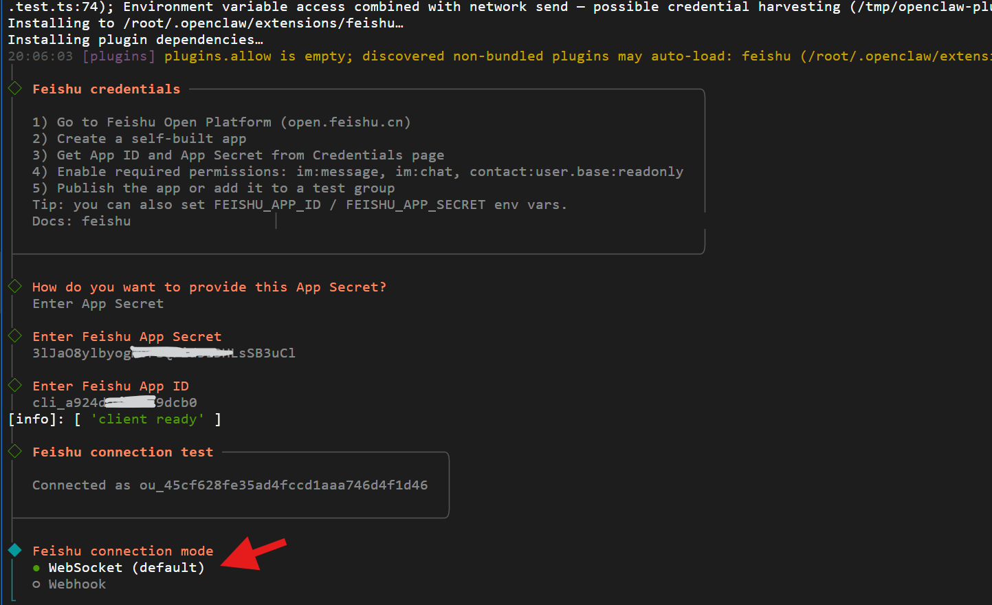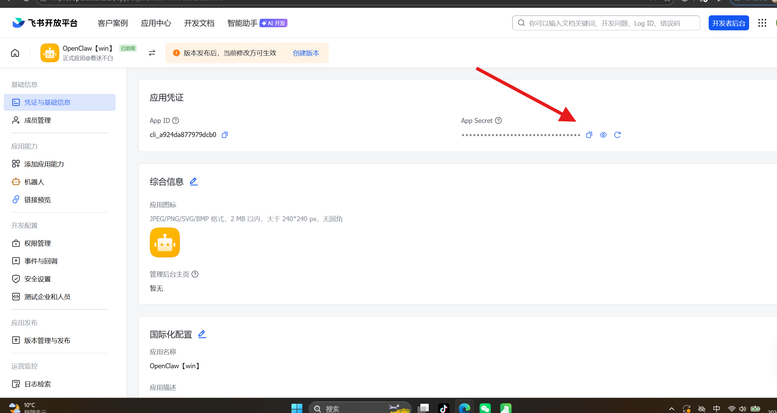 这里提示要输入 APP Secret ,我们去飞书开放平台复制