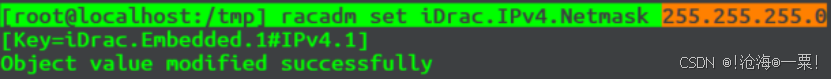 [root@localhost:/tmp]racadm set iDrac.IPv4.Netmask 255.255.255.0