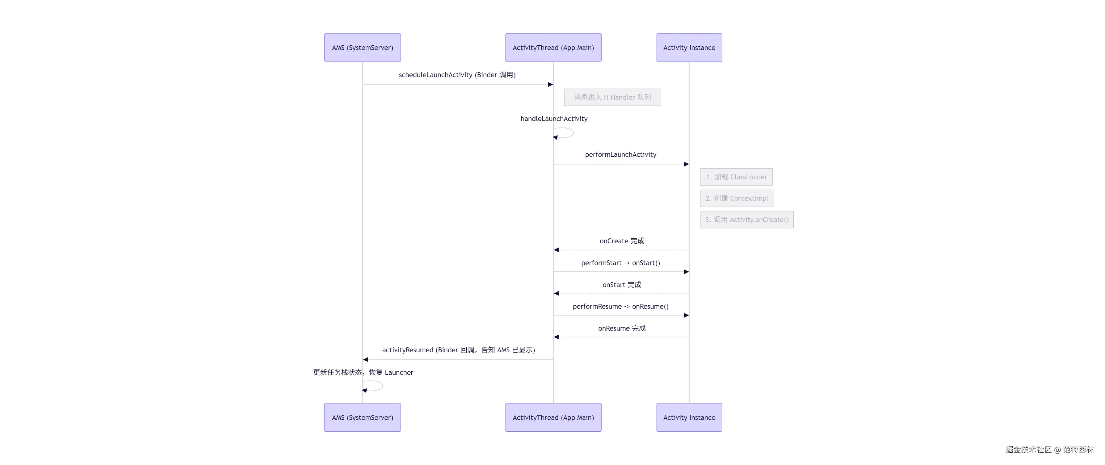 | 回调 | ActivityThread | 通知 AMS "Resumed" | Binder (to AMS) |