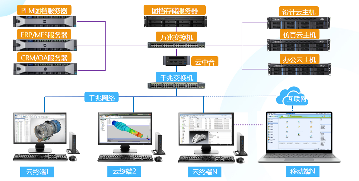 工程师可以随时随地通过低配置终端设备访问云端工作站,获取有权限的硬件算力、应用软件和图纸数据,快速满足工作需求。