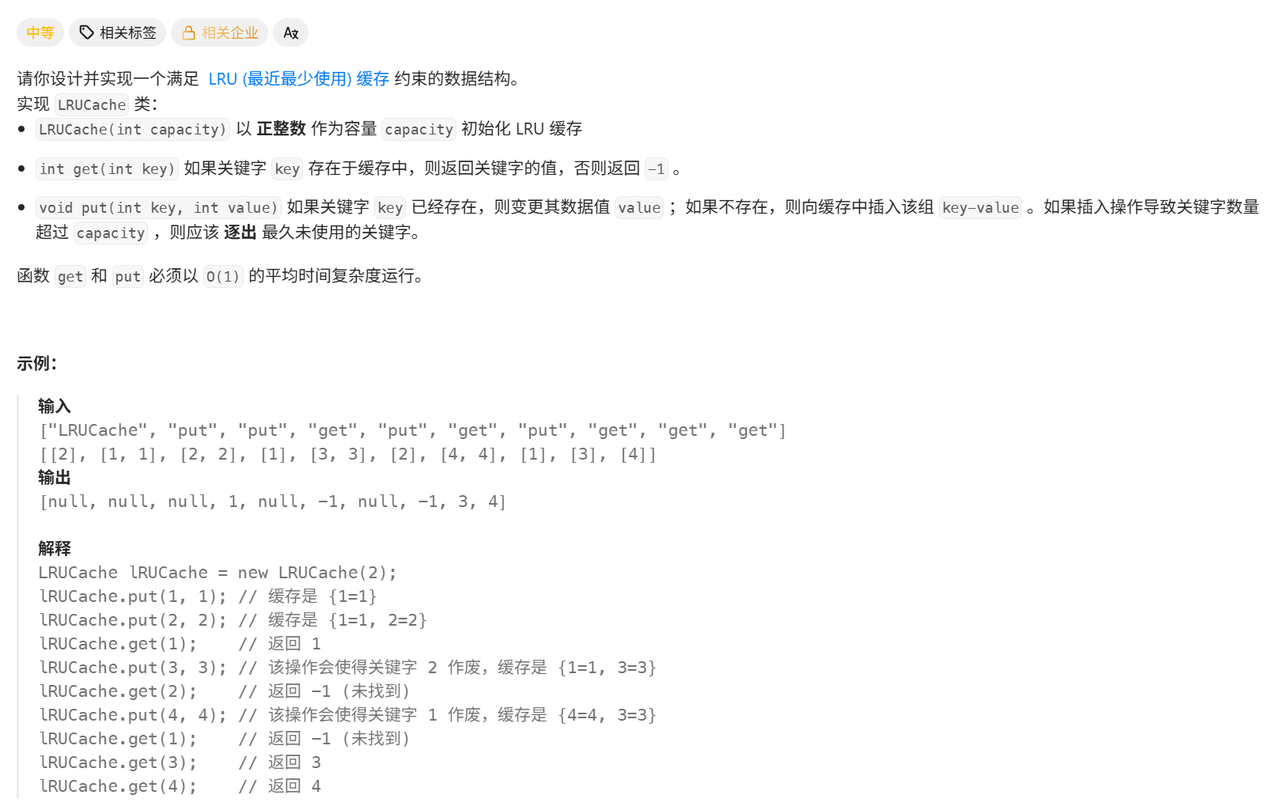 核心逻辑: 通过 "哈希表 + 双向链表" 实现 LRU 缓存 ------ 利用哈希表实现 O (1) 时间的键值查找,利用双向链表维护最近使用顺序(头部为最近使用,尾部为最久未使用),每次访问或插入时将节点移到头部,容量不足时删除尾部节点,保证 get 和 put 操作均为 O (1) 平均时间复杂度。