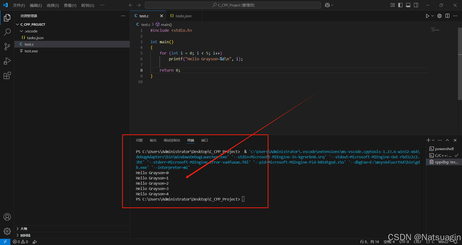 如果想要进行多个 .c 文件编译后的调试,就需要进行一些配置修改。如果进行过一次编译运行,我们会发现在资源管理器的C文件夹下,多出一个.vscode的文件夹,这个文件夹里面有个tasks.json的文件。