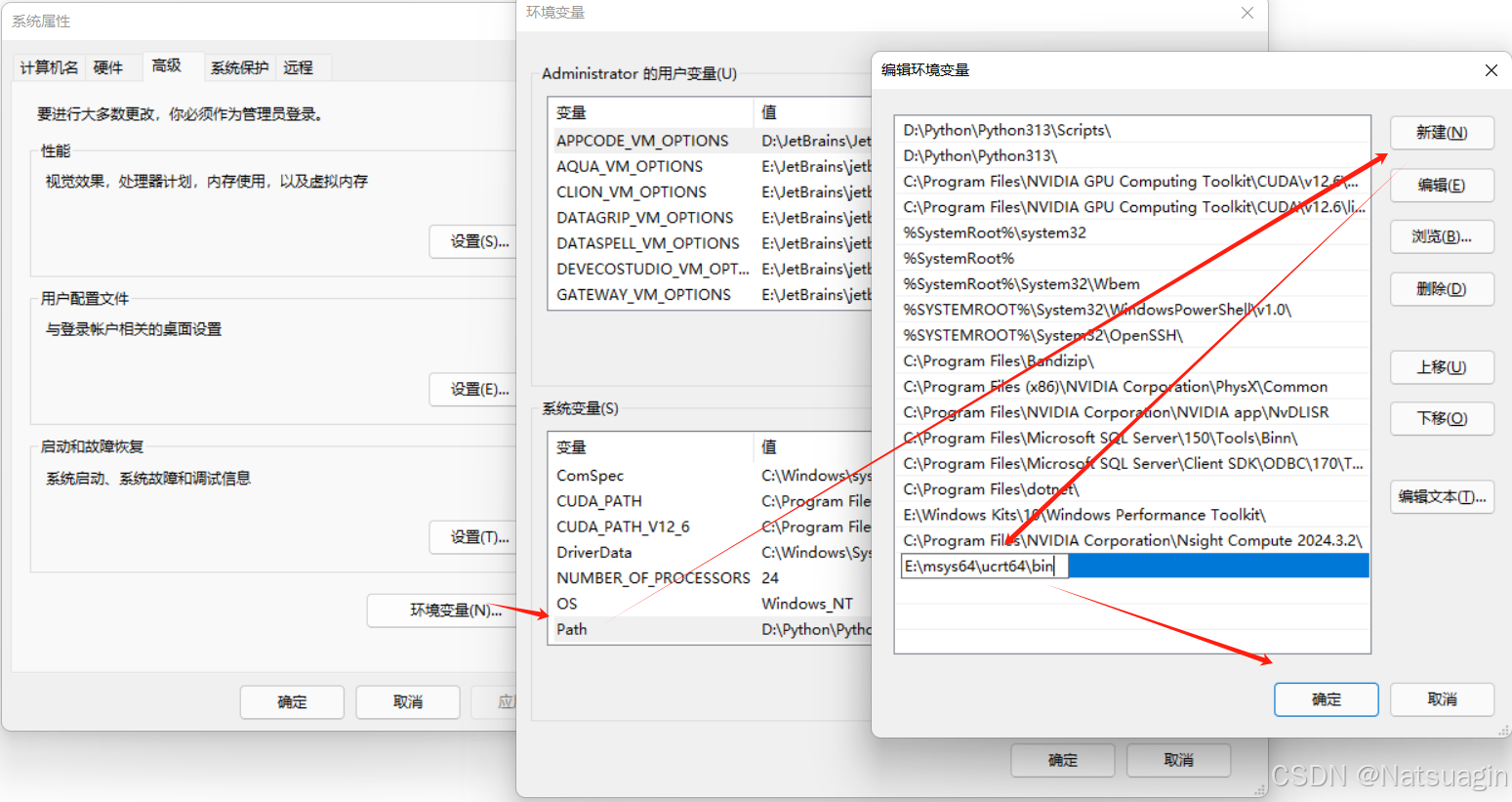 Path变量中添加E:\msys64\ucrt64\bin,然后依次点击三个确认退出。