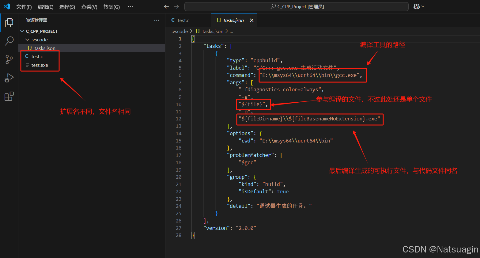 当前的 VS Code 的运行效果还不是很理想,双击打开tasks.json文件修改一下编译运行功能。下图是对该 JSON 文件做了部分解释。