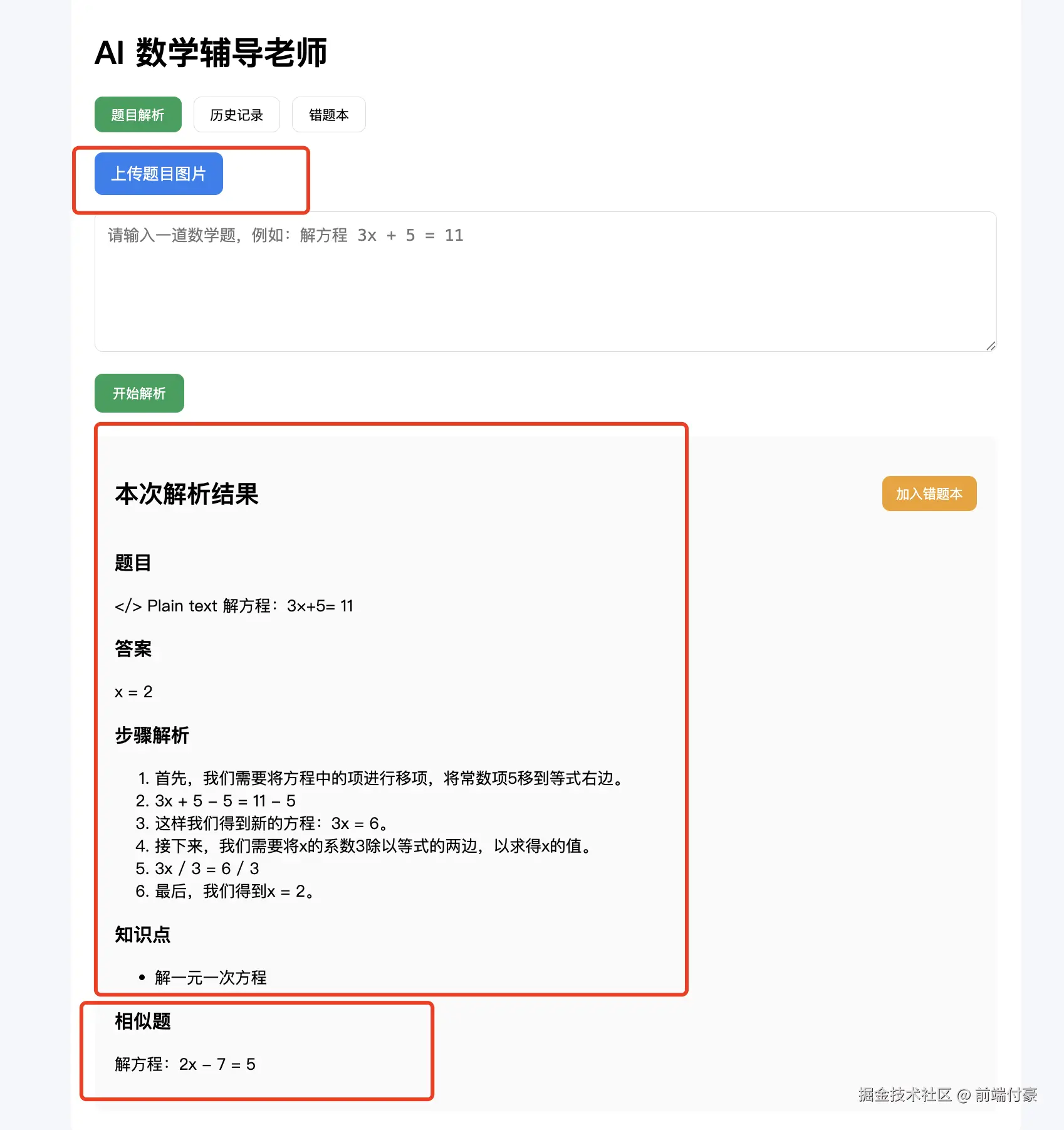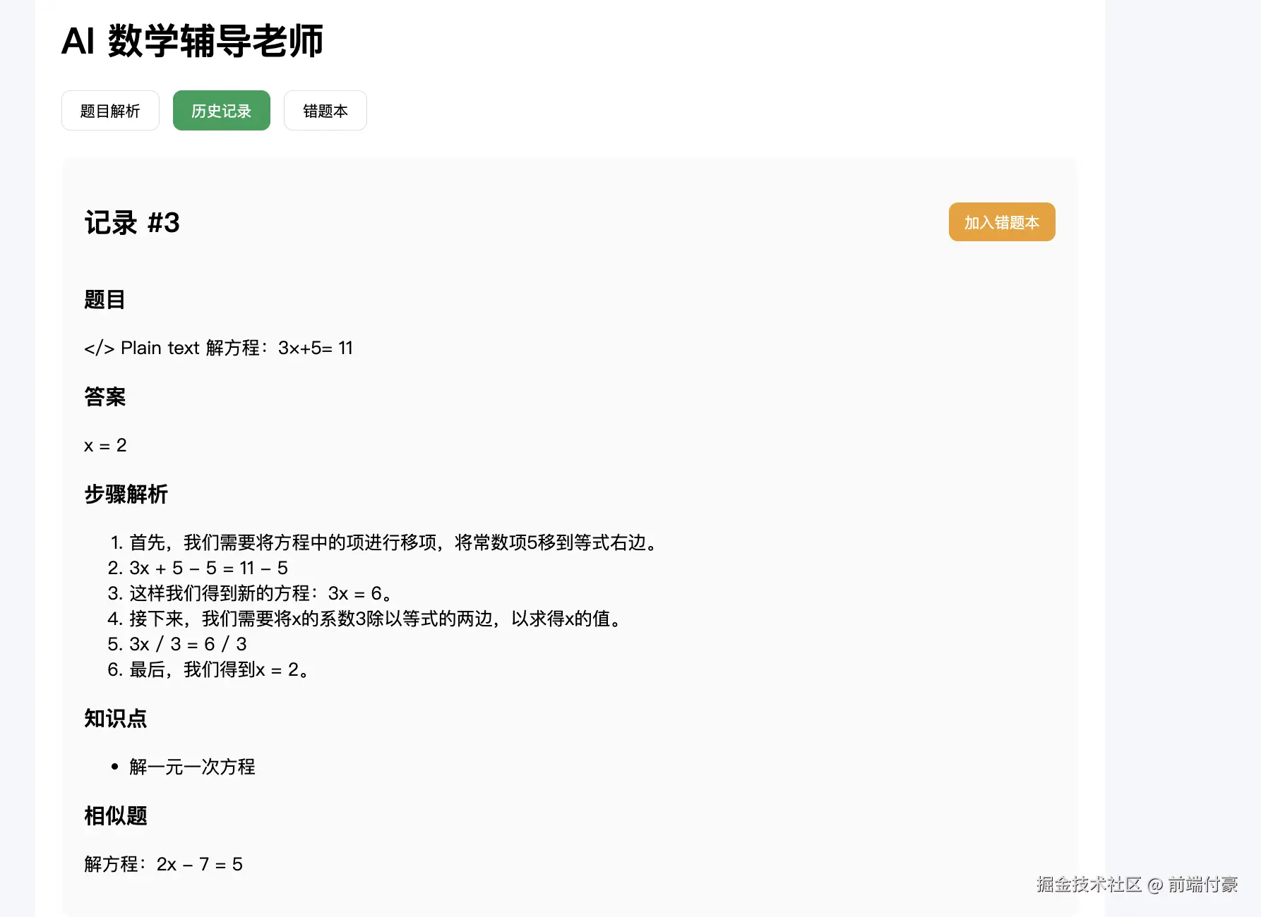 - 页面展示答案 / 步骤 / 知识点 / 相似题