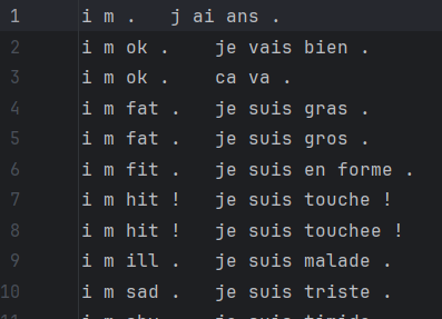 # # {'<UNK>': 1, '.': 2, 'je': 3, 'suis': 4, 'est': 5, 'vous': 6, ...}