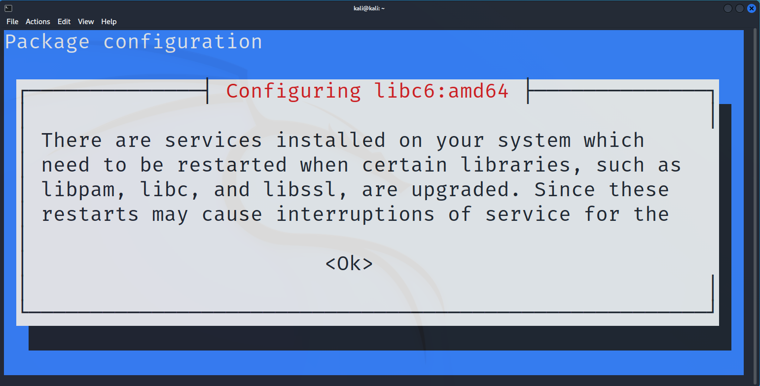 Kali-linux中一般自带Ruby,但为确保所有必要库都已经具备,执行下面这两条指令进行环境更新。(更新过程中需打开VPN以顺利连接Ruby官网,此外过程中可能出现图1所示的提示系统重启界面,属于正常现象,按下Tab键盘然后Enter一下OK,接下来Enter一下Yes即可)