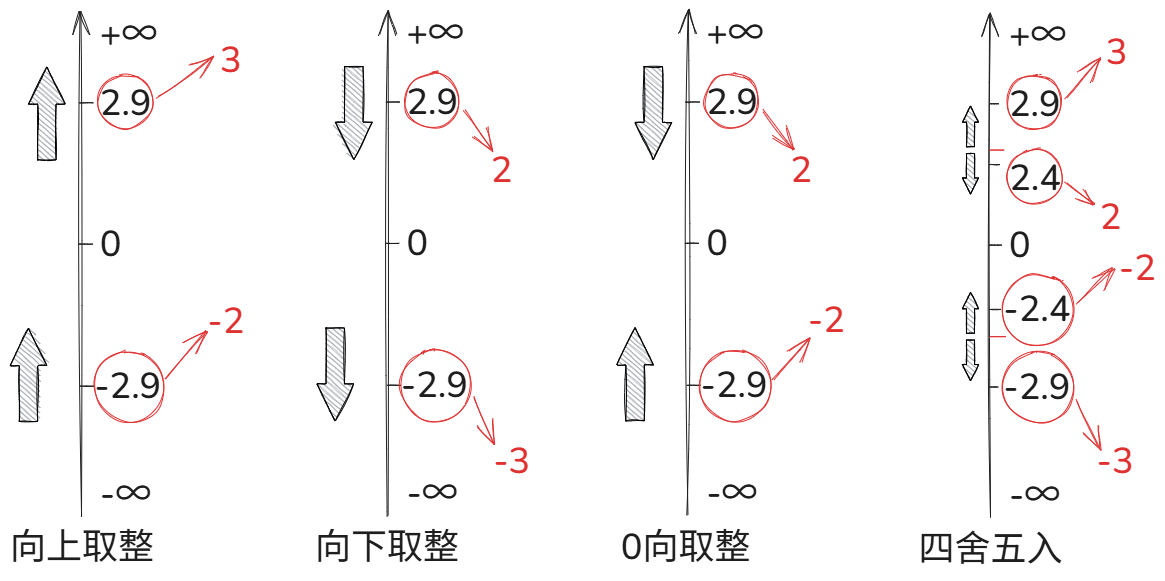 关于取整,常见的取整方式有:0向取整、向上取整、向下取整、四舍五入