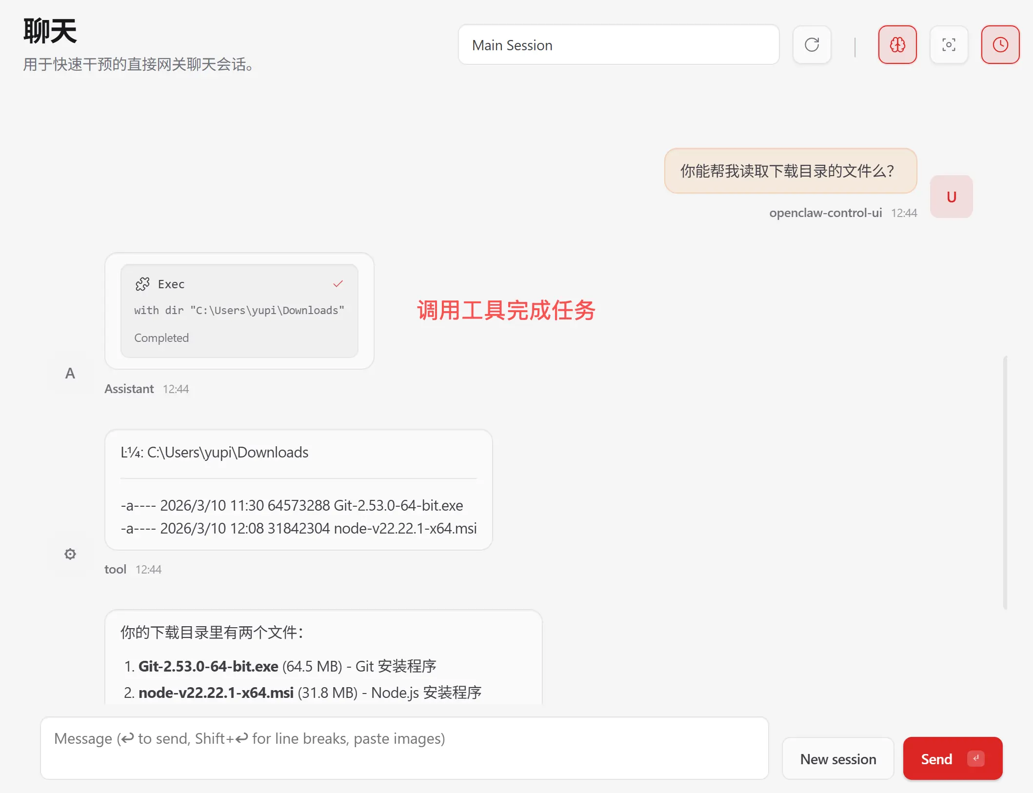 试试让它帮你读取电脑上的文件,比如查看下载目录里有什么: