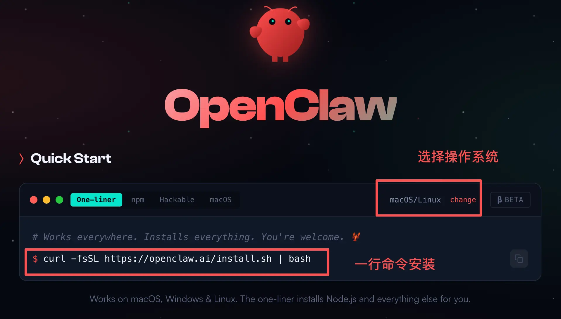 打开 OpenClaw 官网,你会看到官方提供了一行命令来安装。