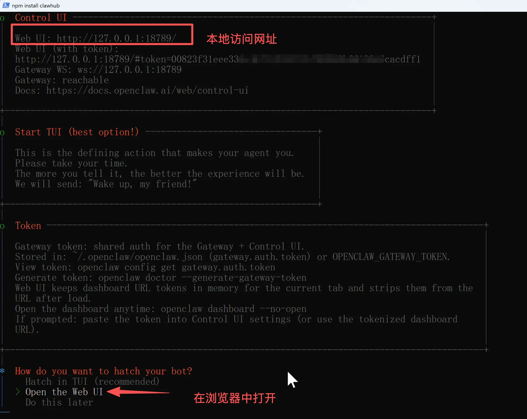 启动成功后,引导程序会问你是在终端界面(TUI)还是网页浏览器中使用 OpenClaw。