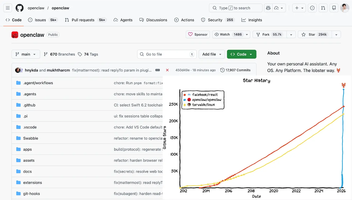 OpenClaw 的火爆程度远超我的想象,从 2025 年 11 月上线,仅用了大约 120 天就登顶 GitHub 星标 历史第一,累计拿下 29 万+ Stars,超过了 Linux、React 等一众前辈!