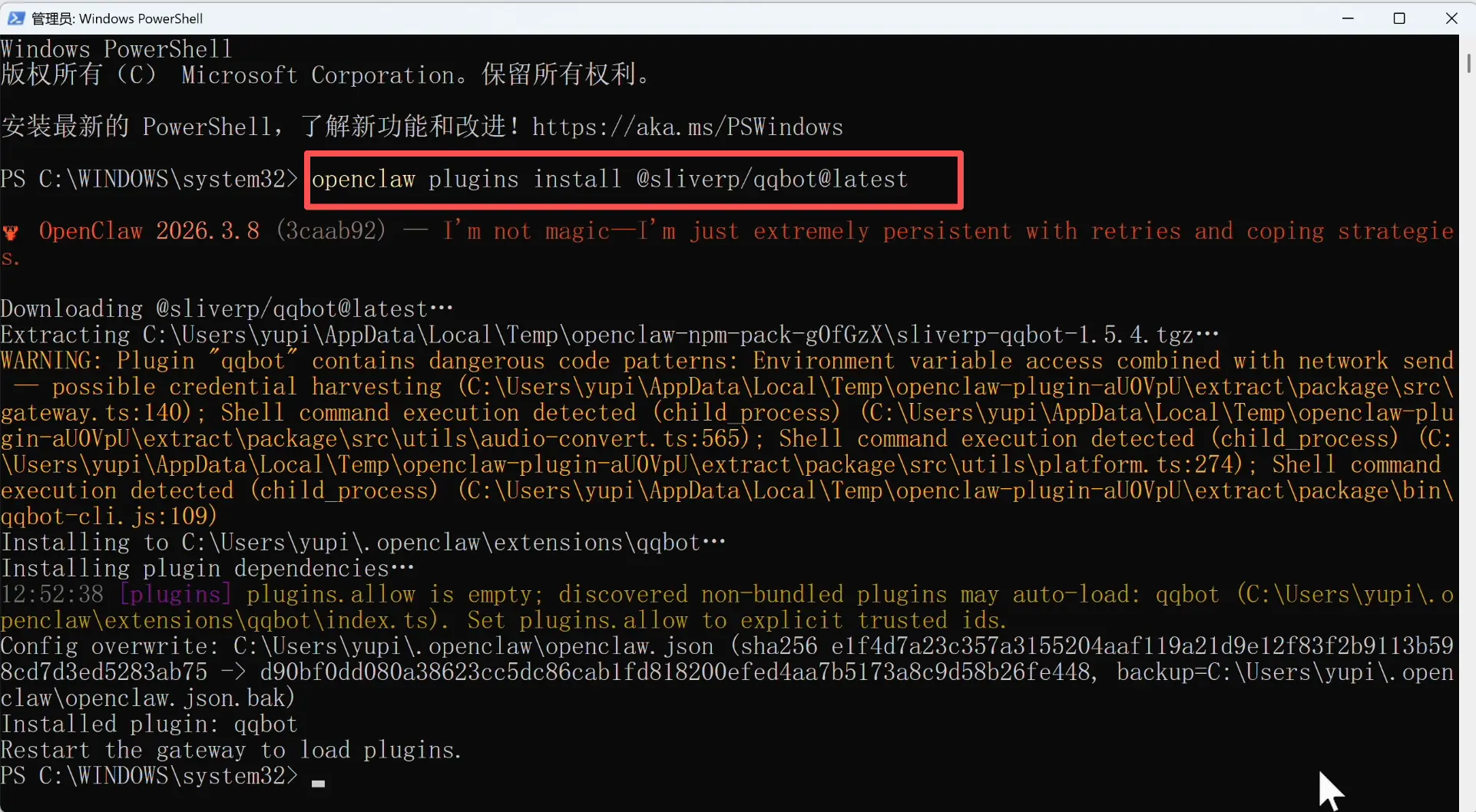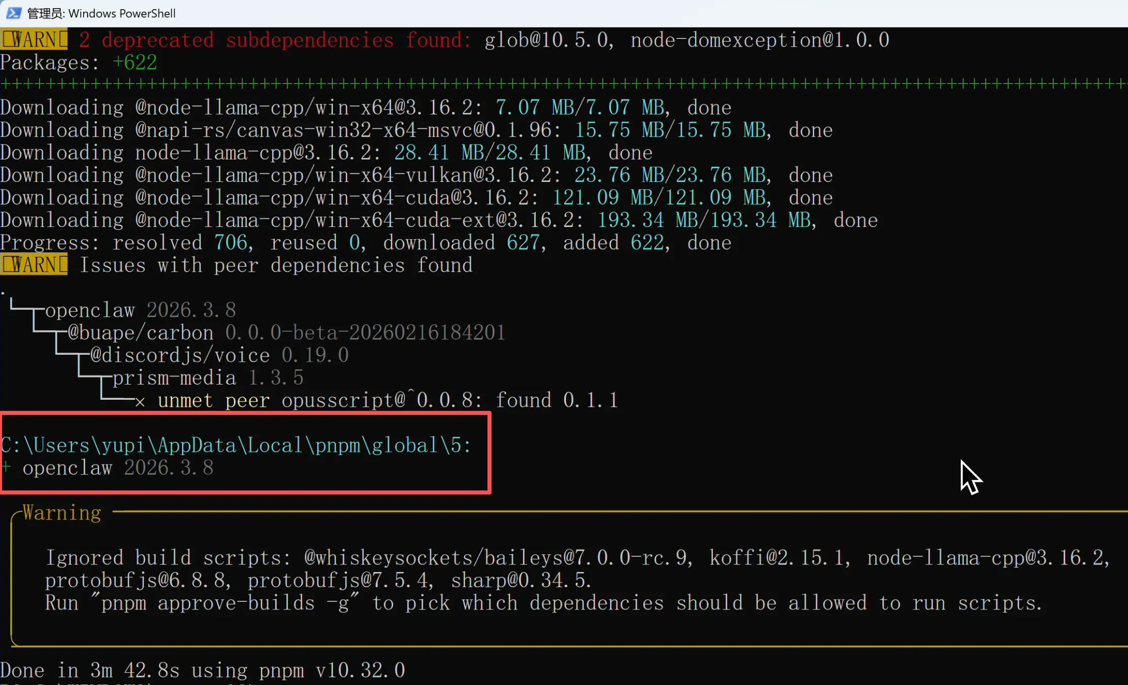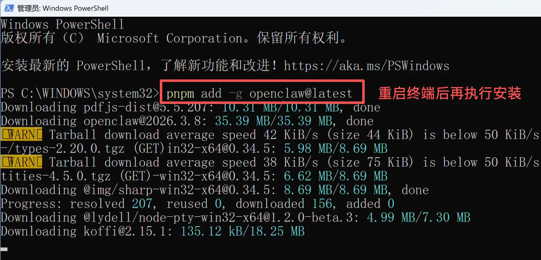 在新的 PowerShell 窗口中,用 pnpm 来安装 OpenClaw: