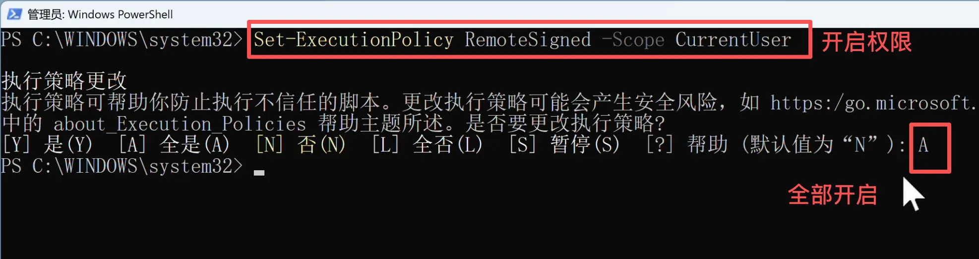 如果弹出确认提示,输入 A 然后按回车即可。这行命令的作用是允许运行来自可信来源的脚本,类似手机上允许安装第三方应用。