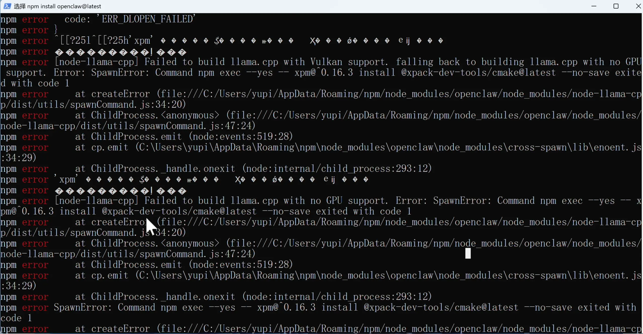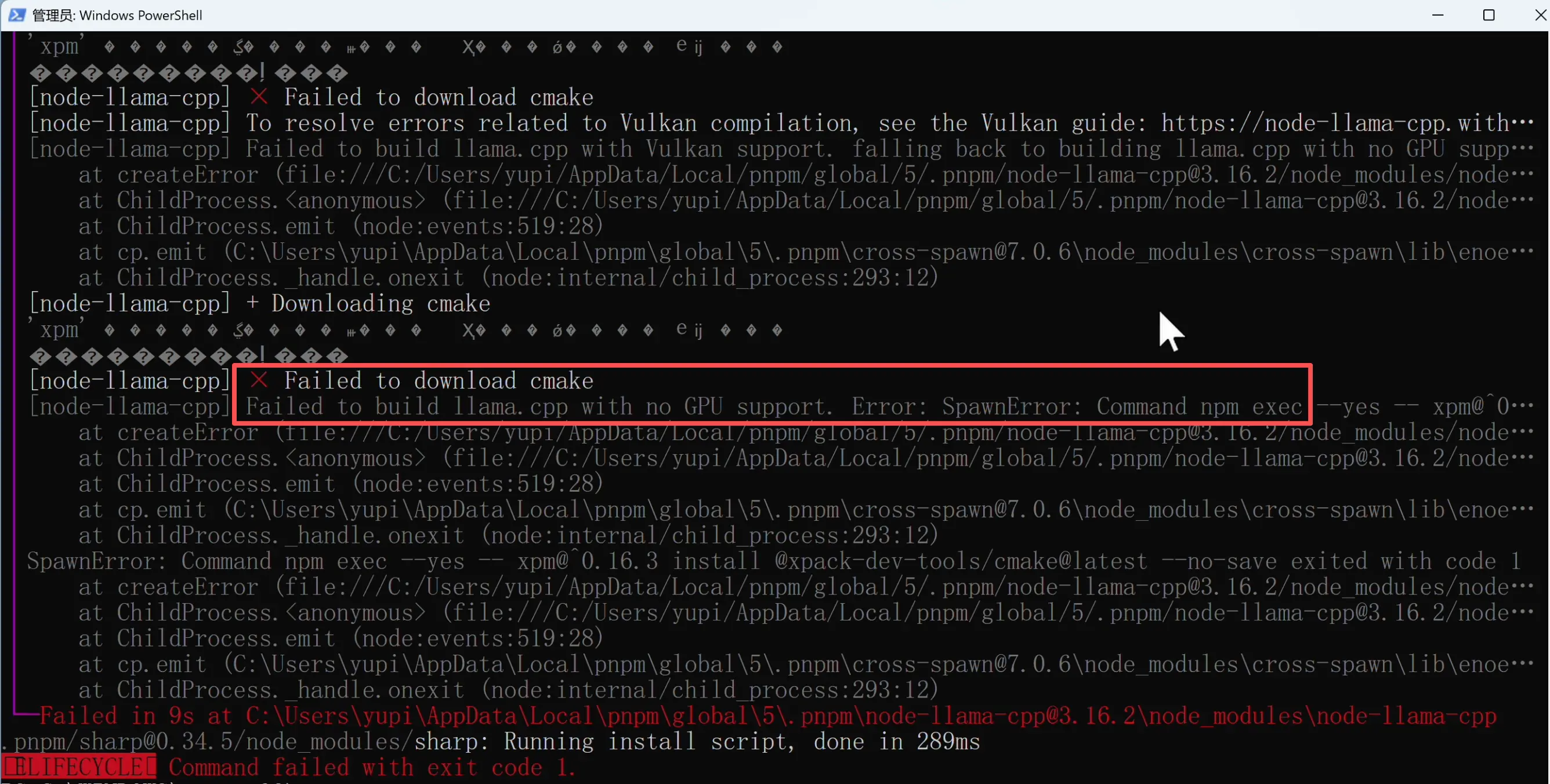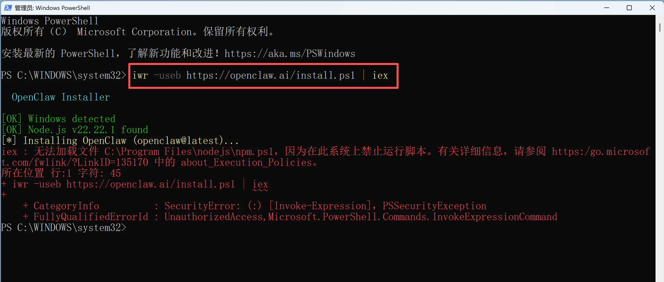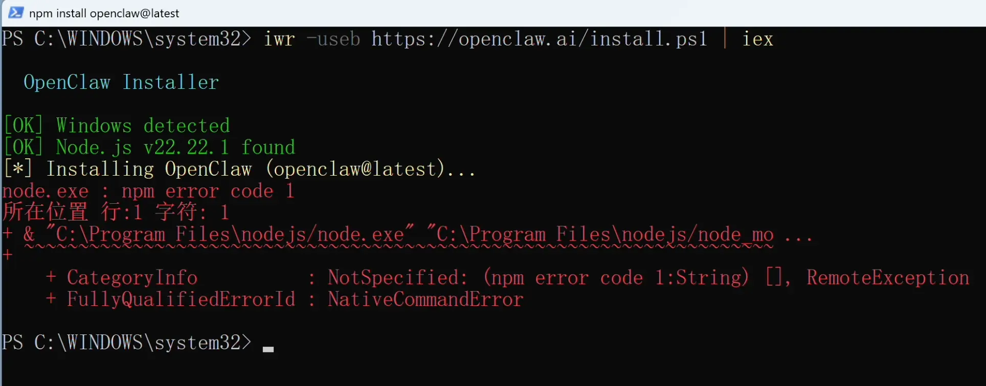 果不其然也报错了,因为一键安装脚本默认就是用 npm 来装的,根本原因一样。